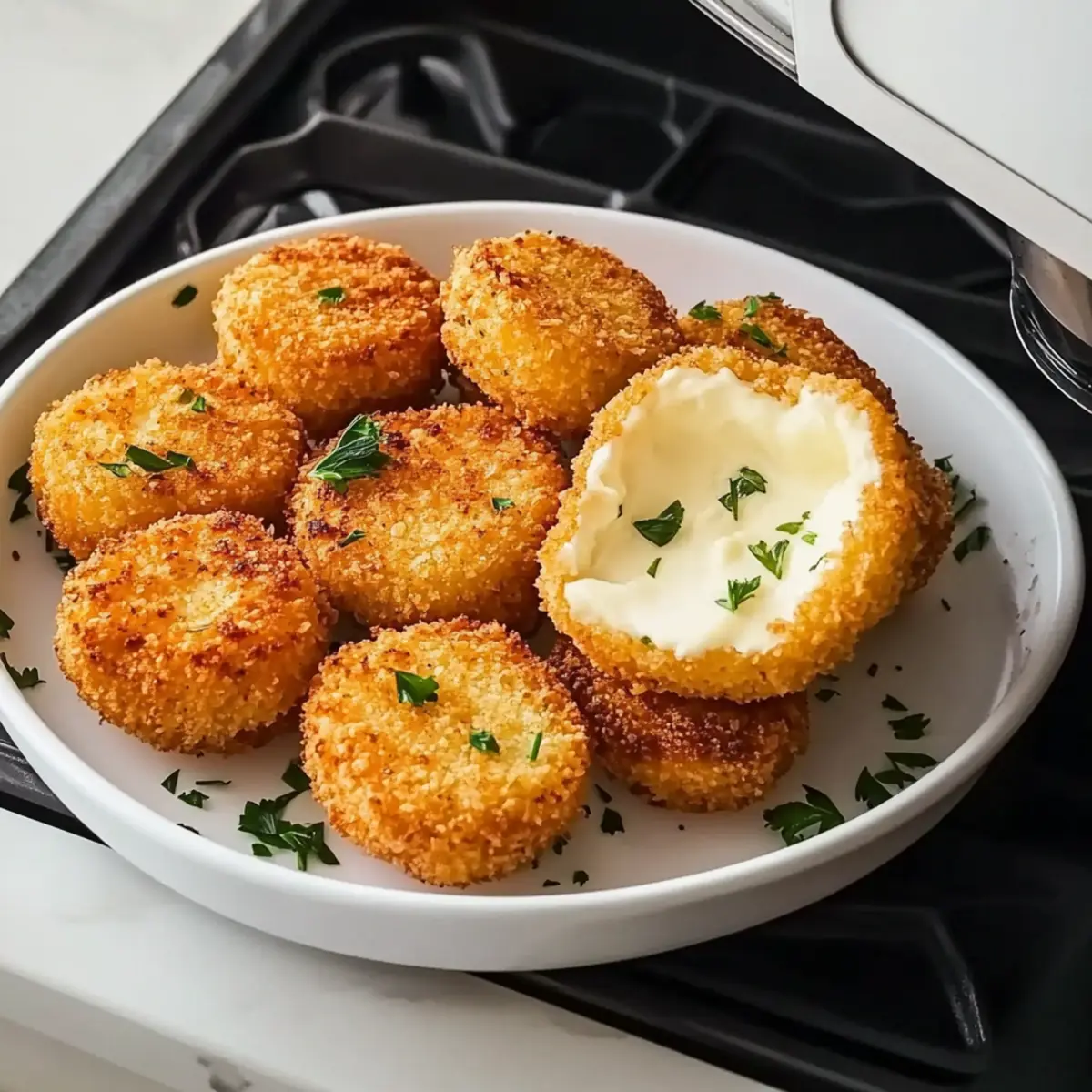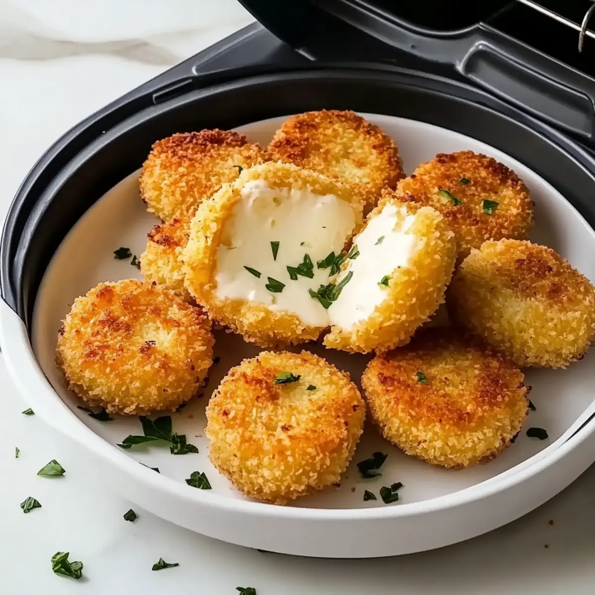 Once your Air Fried Babybel Cheese bites are done cooking, let them cool for 1–2 minutes before serving. This is the perfect time to garnish with chopped parsley for a fresh touch. Enjoy these delicious bites immediately while they’re warm, paired with your favorite dipping sauces for an added flavor experience!