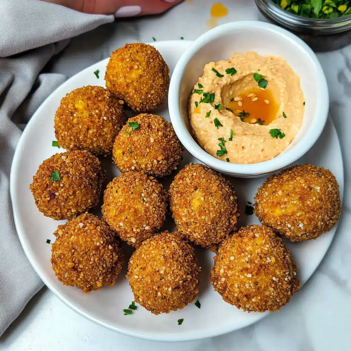 While the air-fried tofu balls are cooking, whisk together your chosen hummus, sriracha, and a splash of water in a small bowl. This zesty dipping sauce complements the savory tofu perfectly. Adjust the water until you reach the desired consistency, allowing the sauce to be smooth and easy to dip.