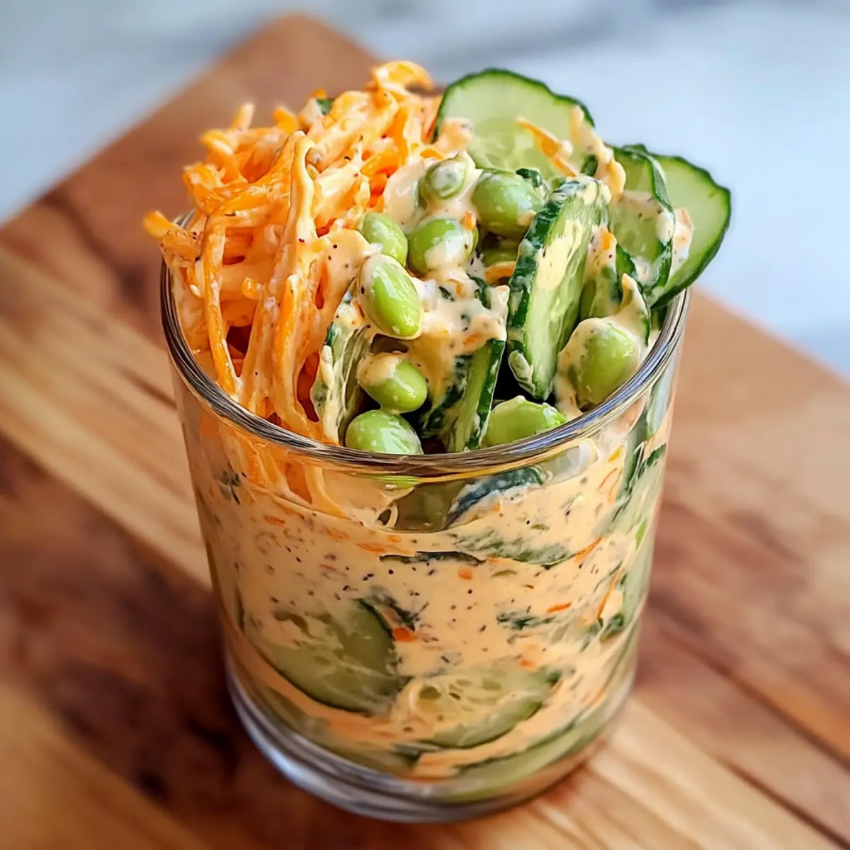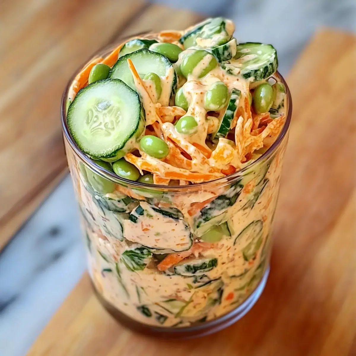Start by thinly slicing the cucumber, ensuring even pieces for a delightful crunch. Layer the sliced cucumbers at the bottom of a large jar or serving bowl, pressing down gently to create a firm base. This will ensure your Creamy Asian Cucumber Salad Bowl has a solid foundation to build upon.
