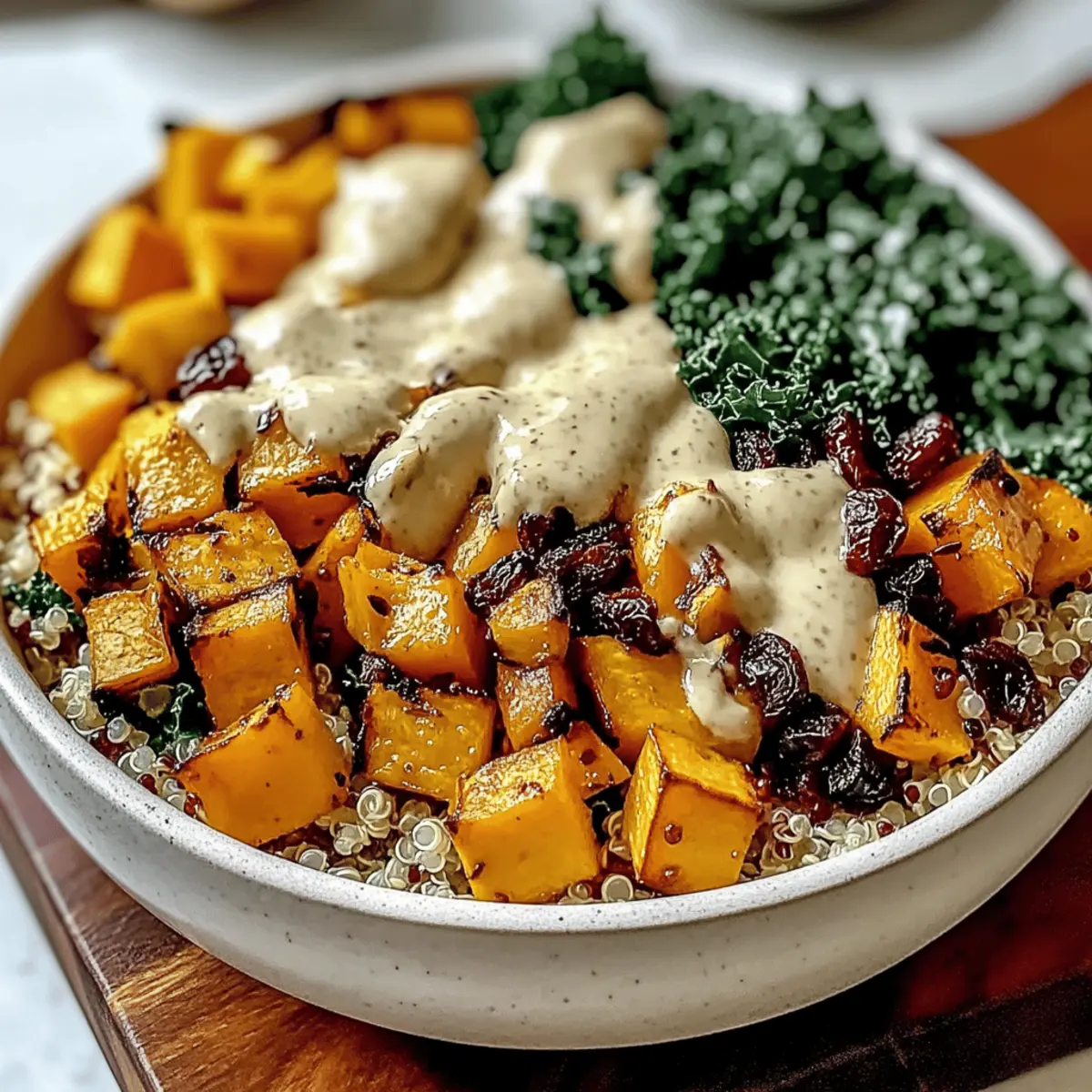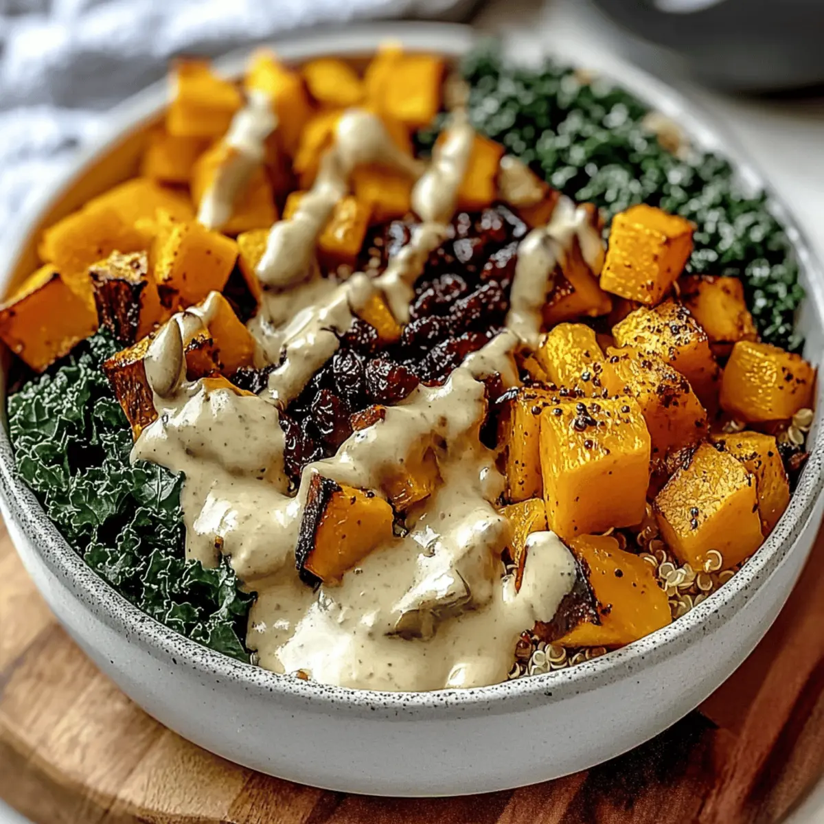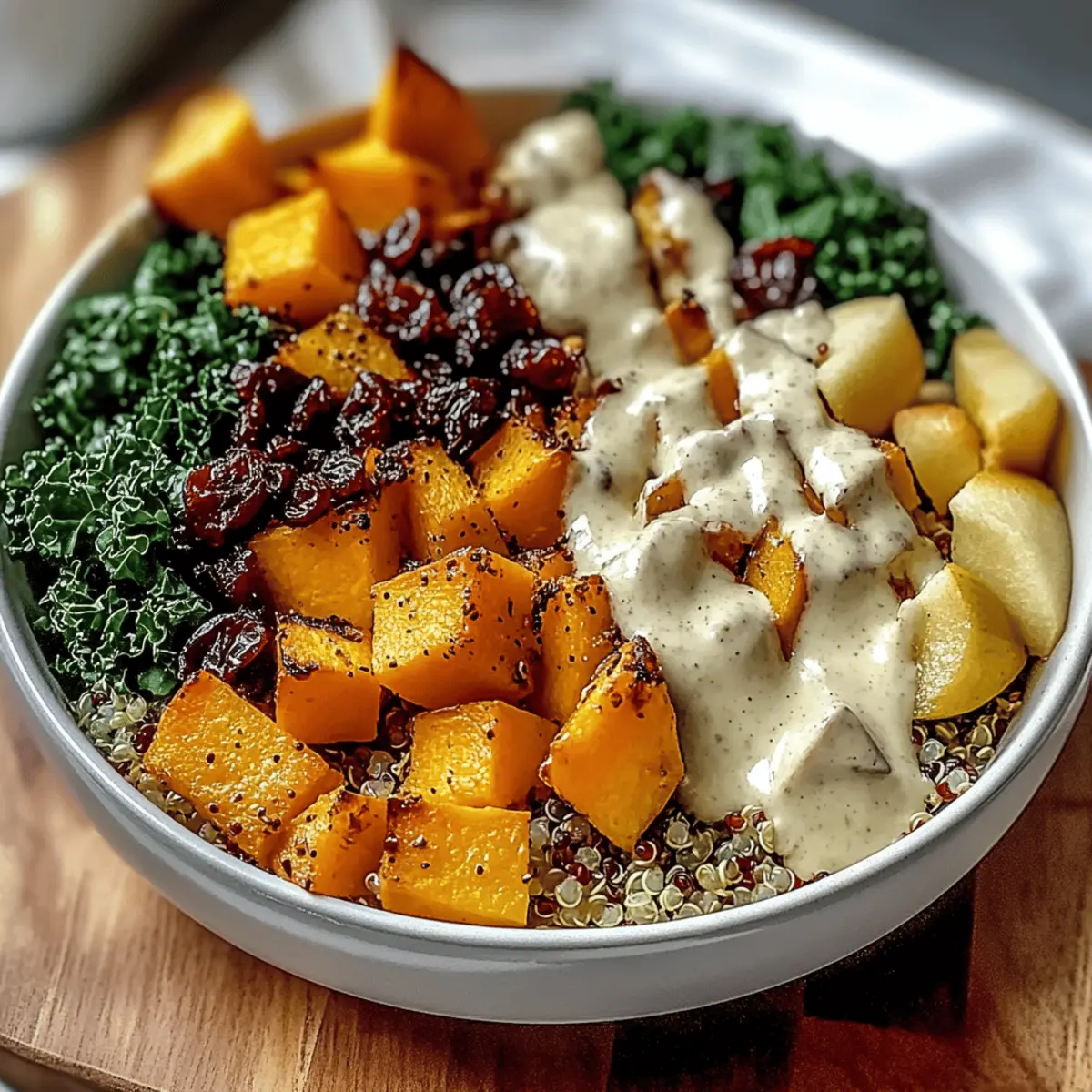 Once everything is prepped, take your cooked quinoa and distribute it into serving bowls. Begin to layer on the roasted butternut squash, the massaged kale, diced apples, dried cranberries, and a sprinkling of pumpkin seeds or nuts. This vibrant arrangement sets the stage for a delightful meal.
