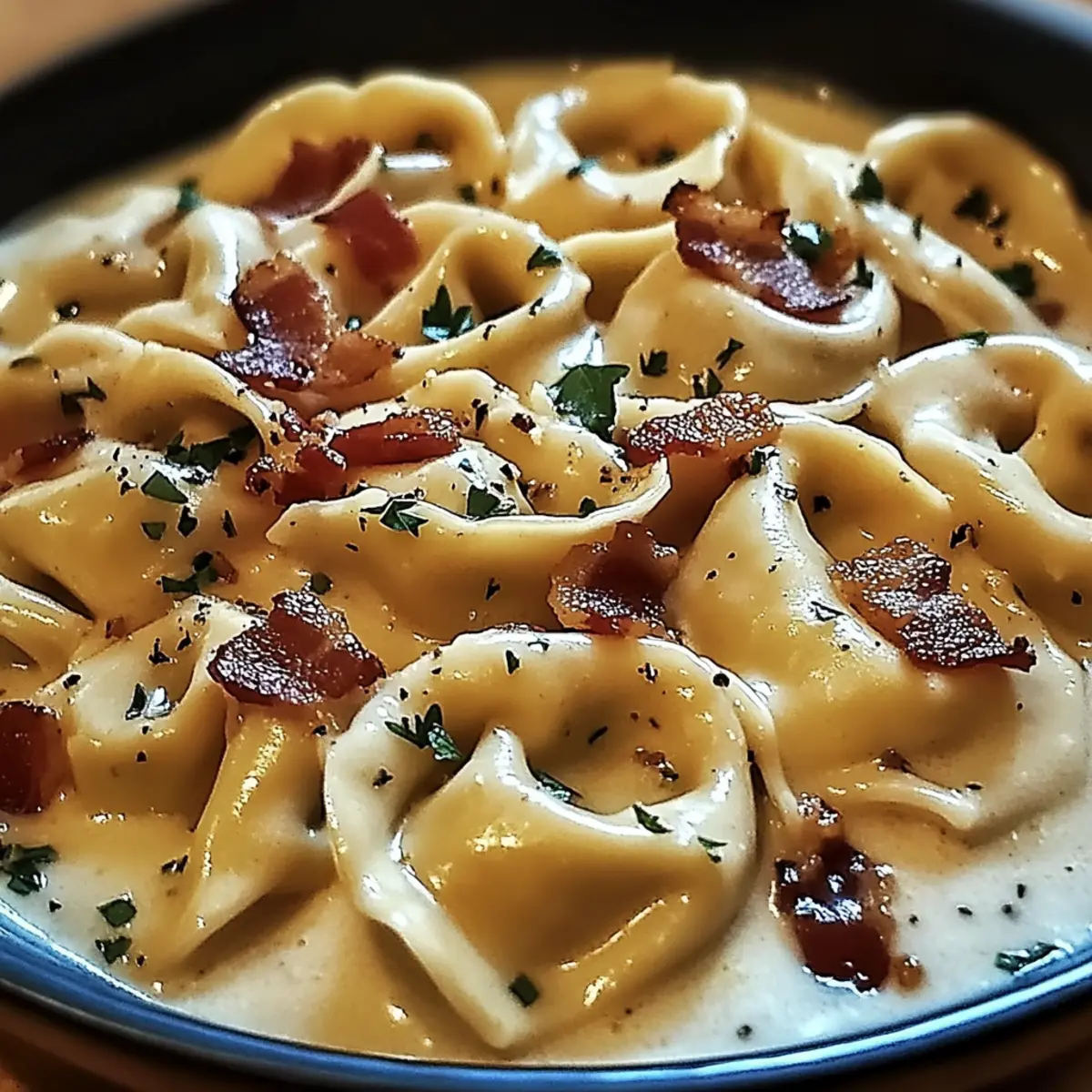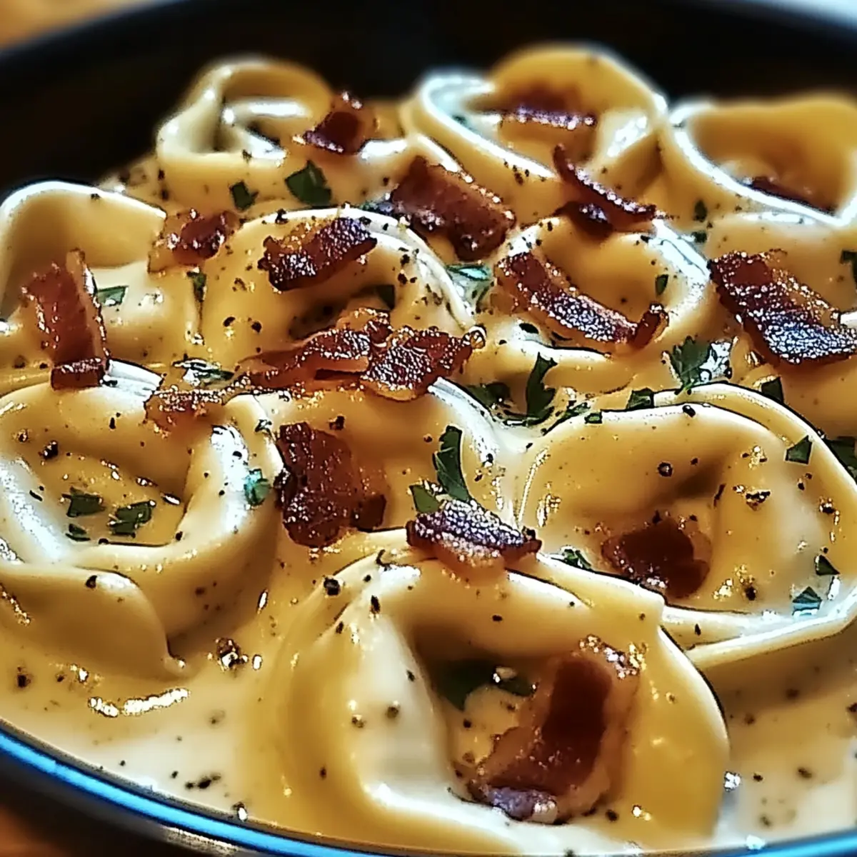 - Fold in cooked tortellini, adding reserved pasta water as needed for creaminess. Mix in crispy bacon.
