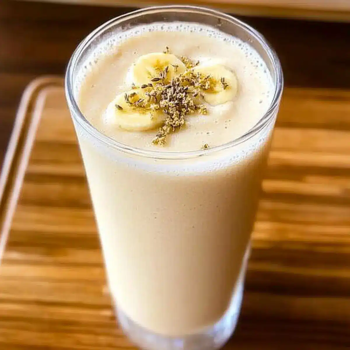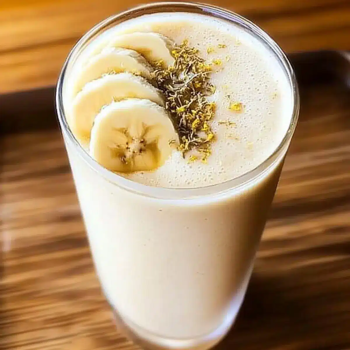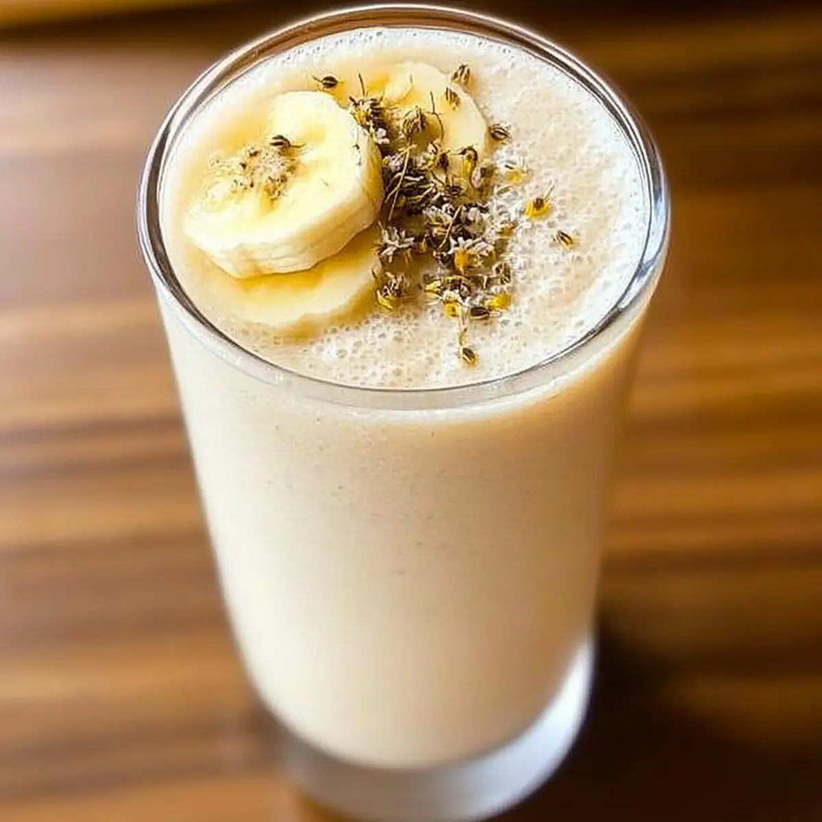 - Serve in a tall glass, garnishing with dried chamomile leaves or a banana slice on the rim.