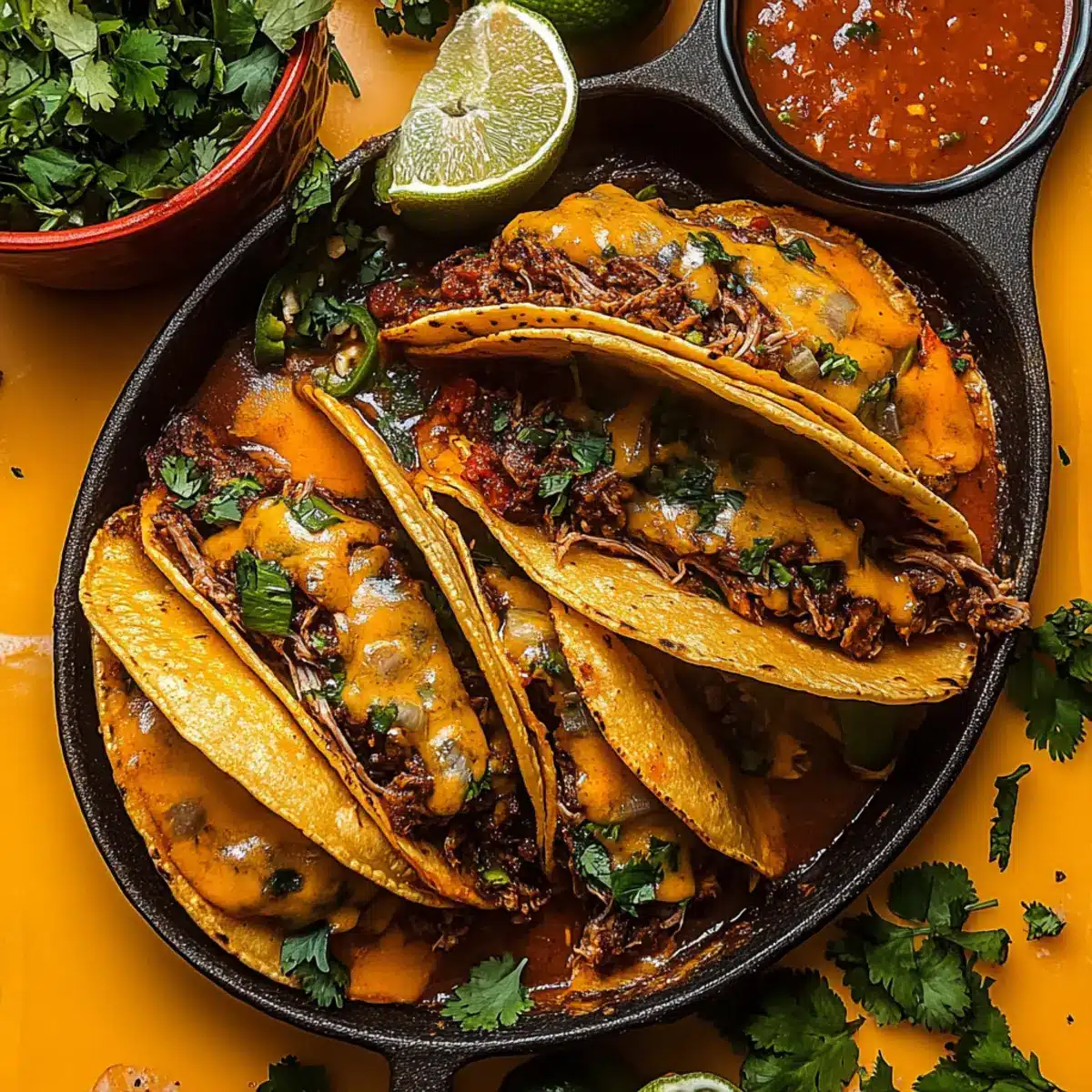 - Assemble Tacos: Dip tortillas in consomé, heat on skillet, fill with beef and cheese, fold and fry until golden.
