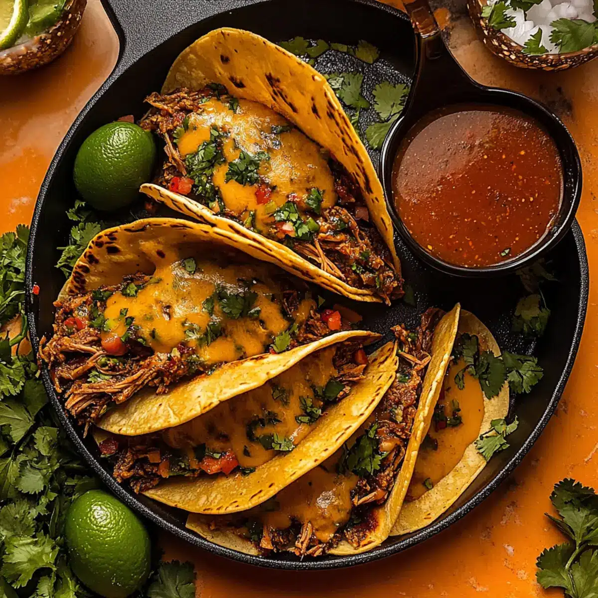 Plate your savory Birria Tacos with a small bowl of the leftover consomé for dipping, adding extra depth to each bite. Garnish with fresh cilantro and pico de gallo for a pop of color and freshness. These beautifully crispy tacos are bursting with flavor, inviting everyone to savor every moment of this delightful culinary experience.