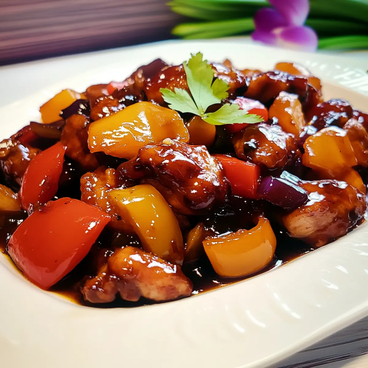 Irresistible Flavors: This Sweet and Sour Chicken brings together vibrant bell peppers and eggplant, all enveloped in a luscious black vinegar sauce that adds an unforgettable tang.