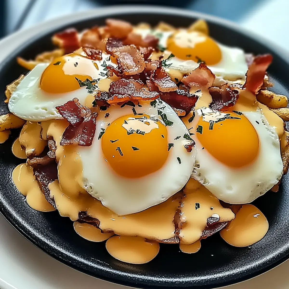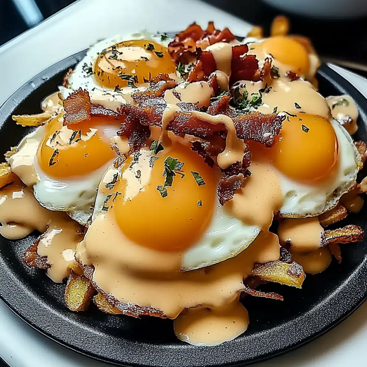 - Layer crispy hash browns on a plate. Top with sunny-side-up eggs, crumbled bacon, cheddar, and mozzarella cheese. Drizzle with gravy.