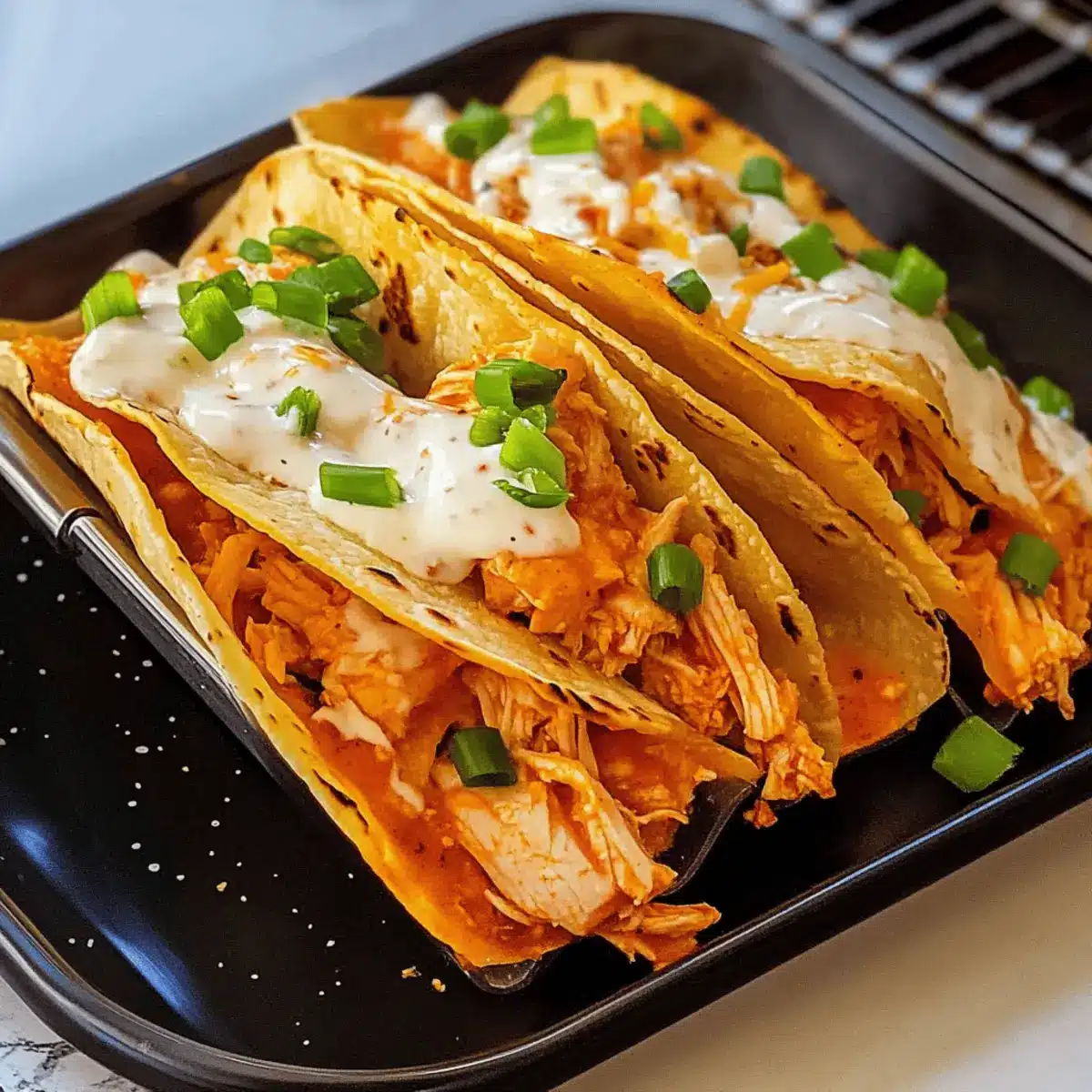 Once your Buffalo chicken tacos are golden and crispy, remove them from the skillet. Top them with freshly chopped green onions and additional toppings like cilantro or diced tomatoes if desired. Serve these delightful tacos immediately while they’re still warm and crispy for a satisfying meal that the whole family will love.