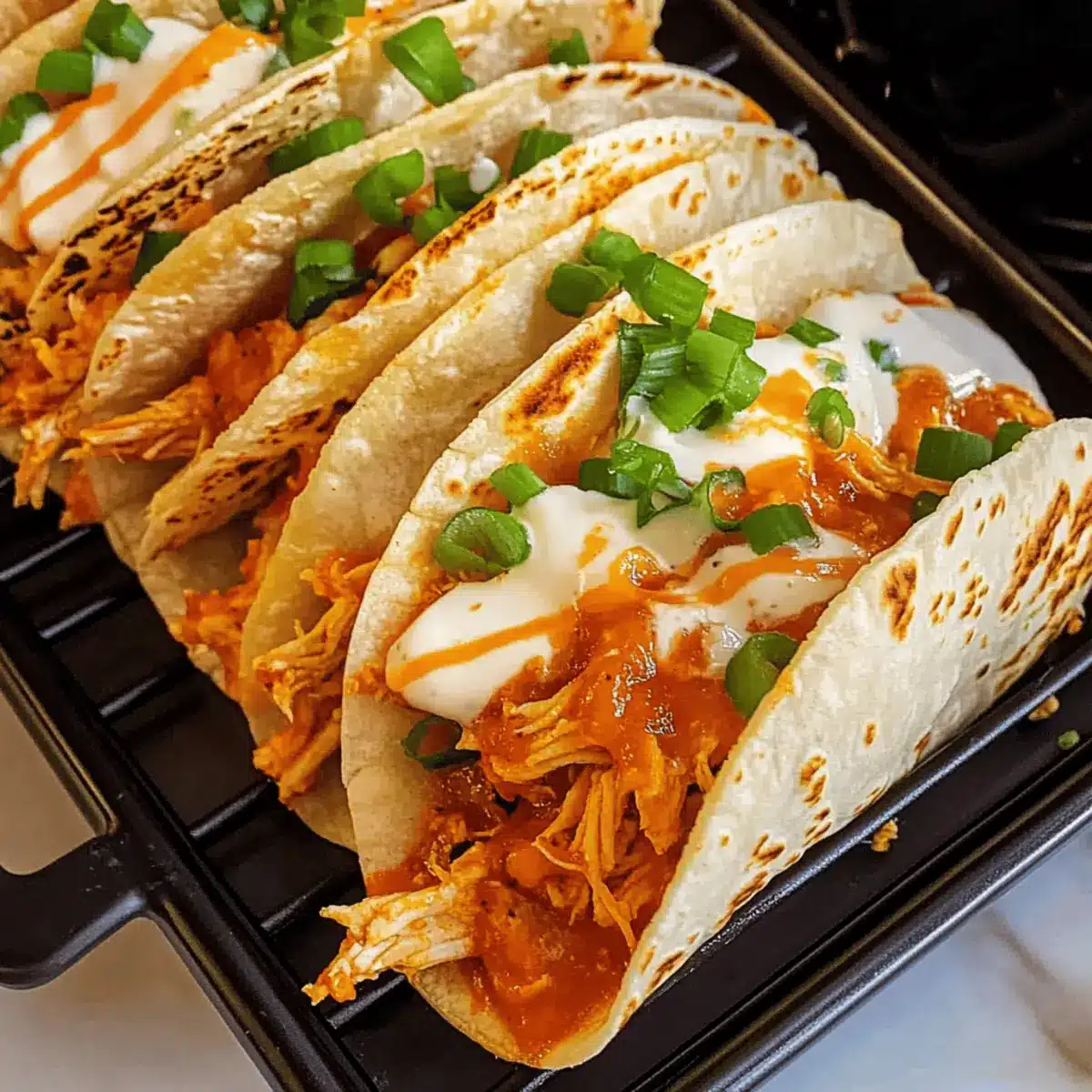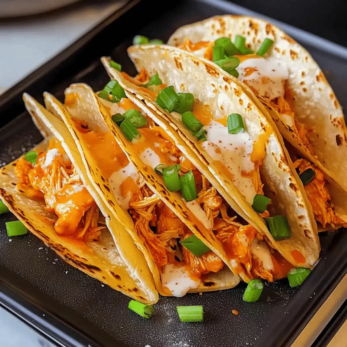 Once golden and cheesy, remove the tacos from the skillet and place them on plates. Top each taco with chopped green onions for a burst of freshness. If desired, feel free to add other toppings such as diced tomatoes or jalapeños. Serve immediately and relish the delightful flavors of your Buffalo Chicken Tacos!