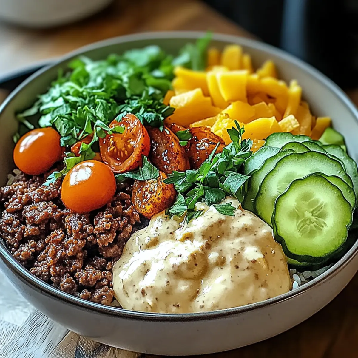 Flavor explosion: These Burger Bowls radiate the classic taste of a burger while showcasing a fresh twist with vibrant veggies.
