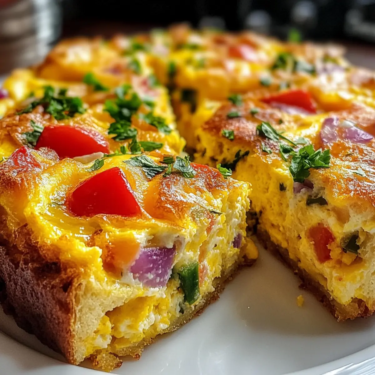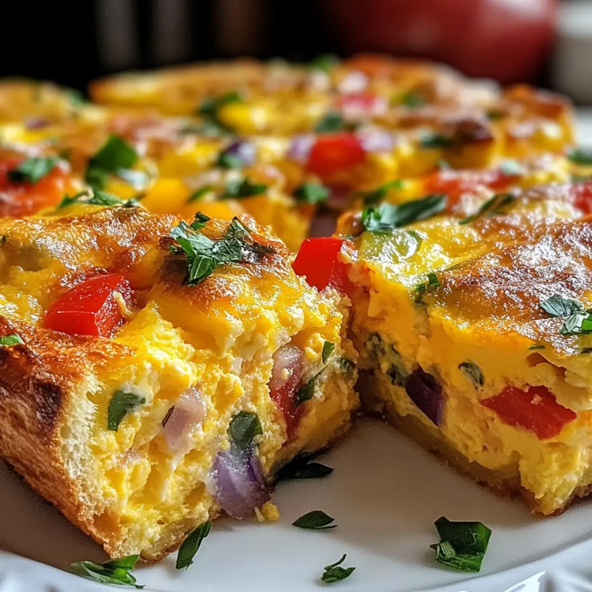 After baking, let the frittata cool for about 5 minutes in the dish before slicing into squares. This rest period makes it easier to cut without falling apart. If desired, garnish each slice with chopped parsley for a touch of color and freshness, enhancing the appeal of your Cheesy Breakfast Biscuit Frittata.