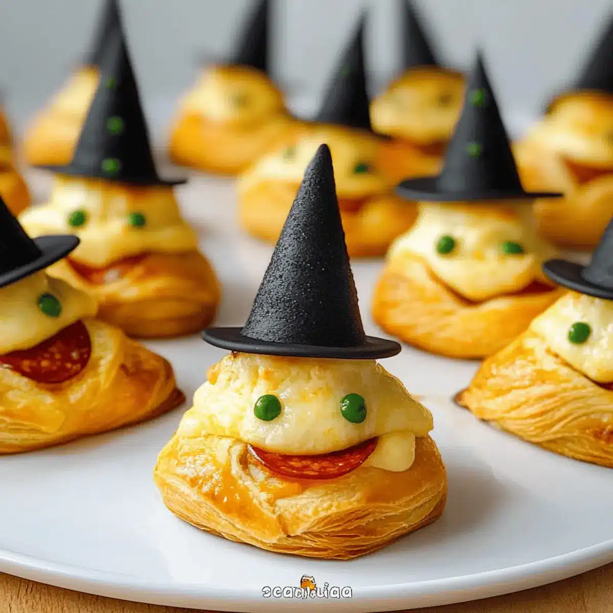 Transfer the assembled witch hats to your prepared baking sheet, spacing them apart to allow for puffing. Bake them in the preheated oven for 15 minutes or until they are a beautiful golden brown. The crescent rolls should have a flaky exterior and a deliciously gooey center, filling your kitchen with an inviting aroma!