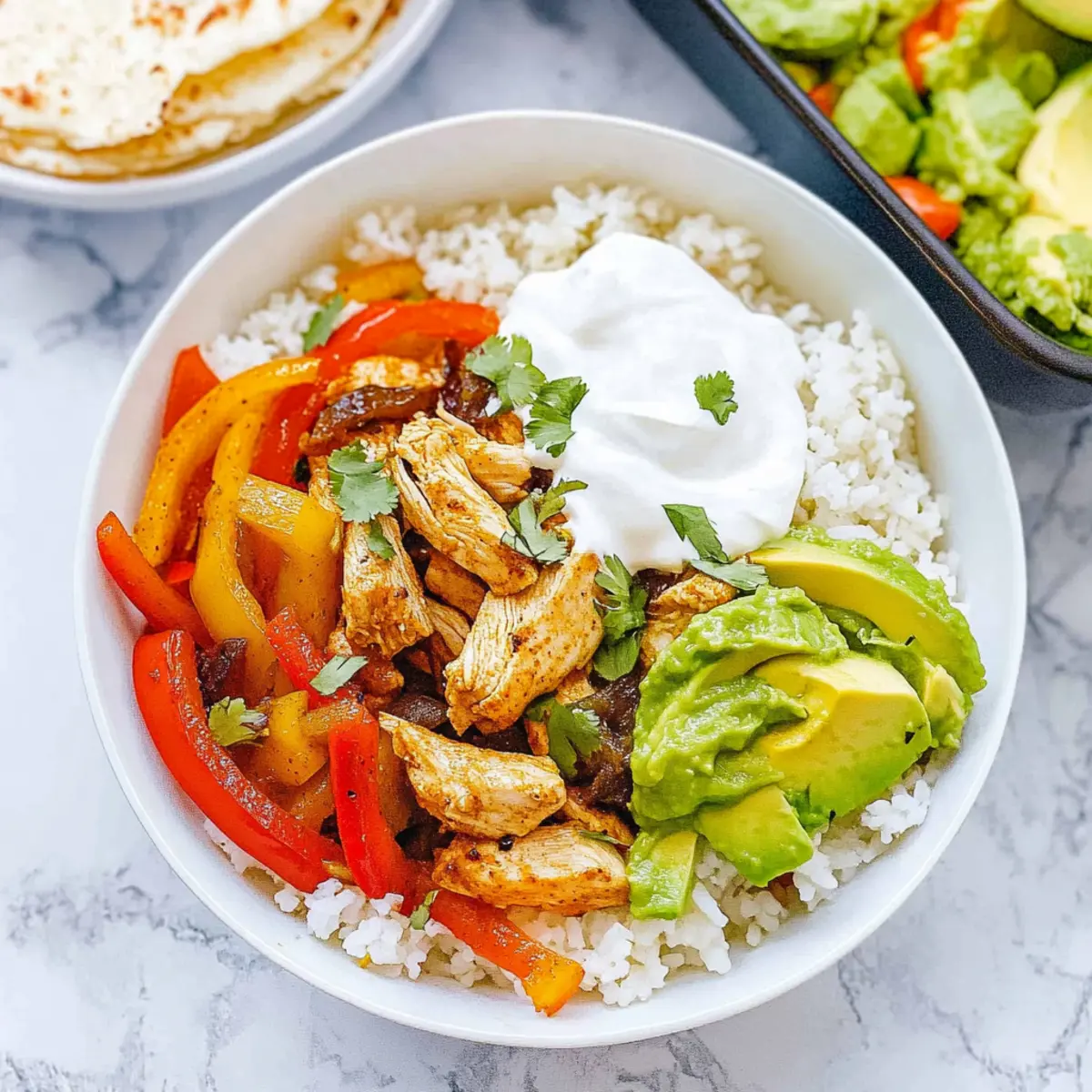 Now it’s time to build your bowls! Start with a layer of crispy lettuce to add freshness, then spoon a generous amount of cilantro lime rice on top. Add your shredded chicken and roasted vegetables, and finally, top with dollops of sour cream and smashed avocado as desired. Your vibrant Chicken Fajita Rice Bowl is now ready to be enjoyed!