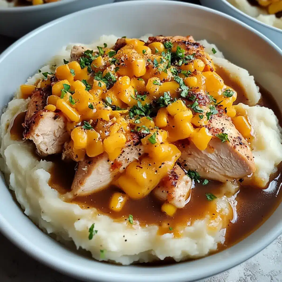 - Assemble the bowls with mashed potatoes, corn, chicken, and drizzle with gravy.