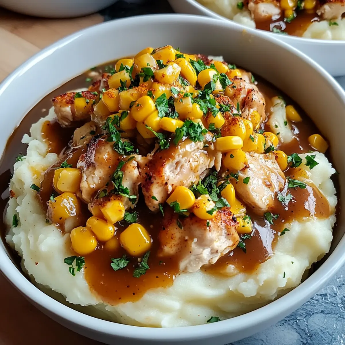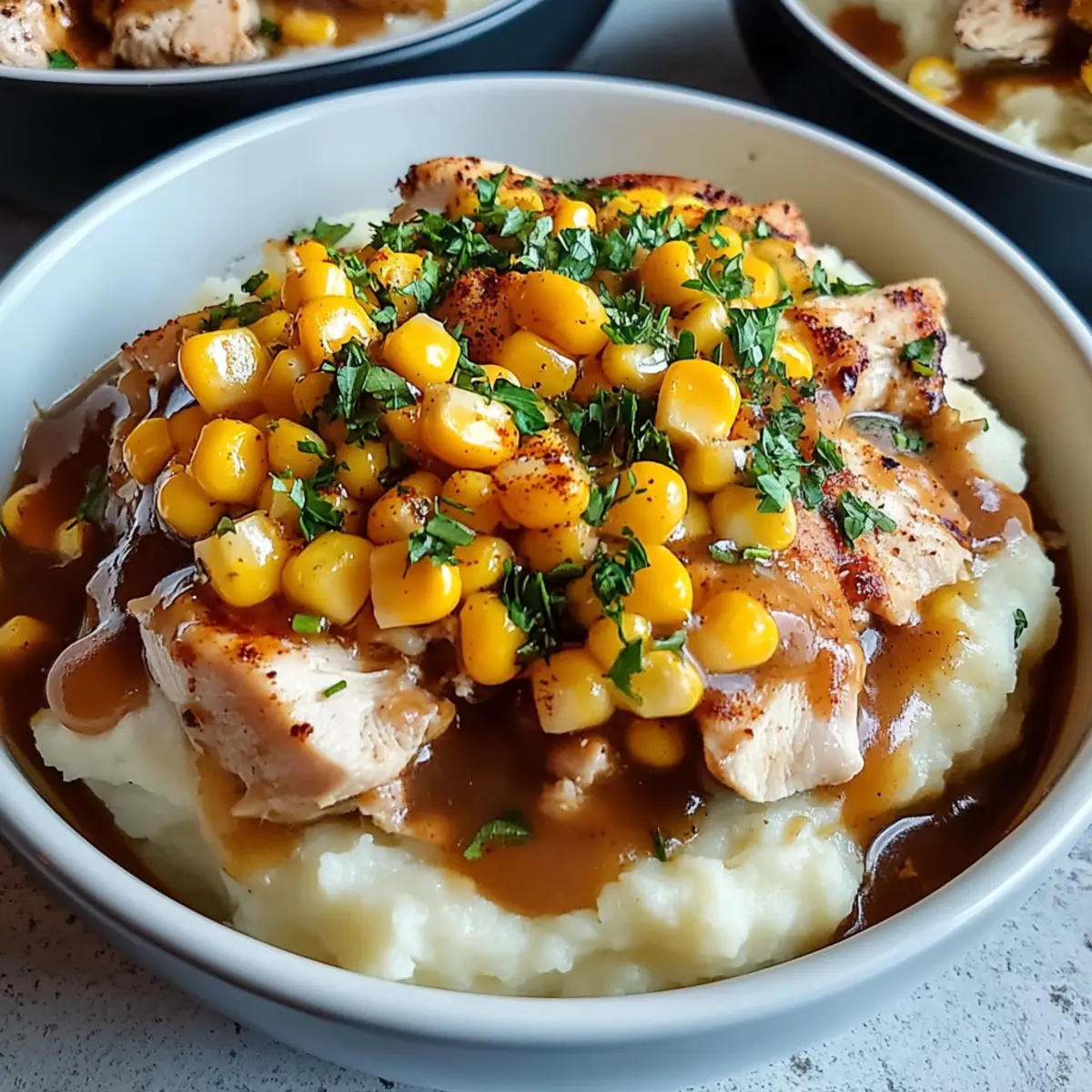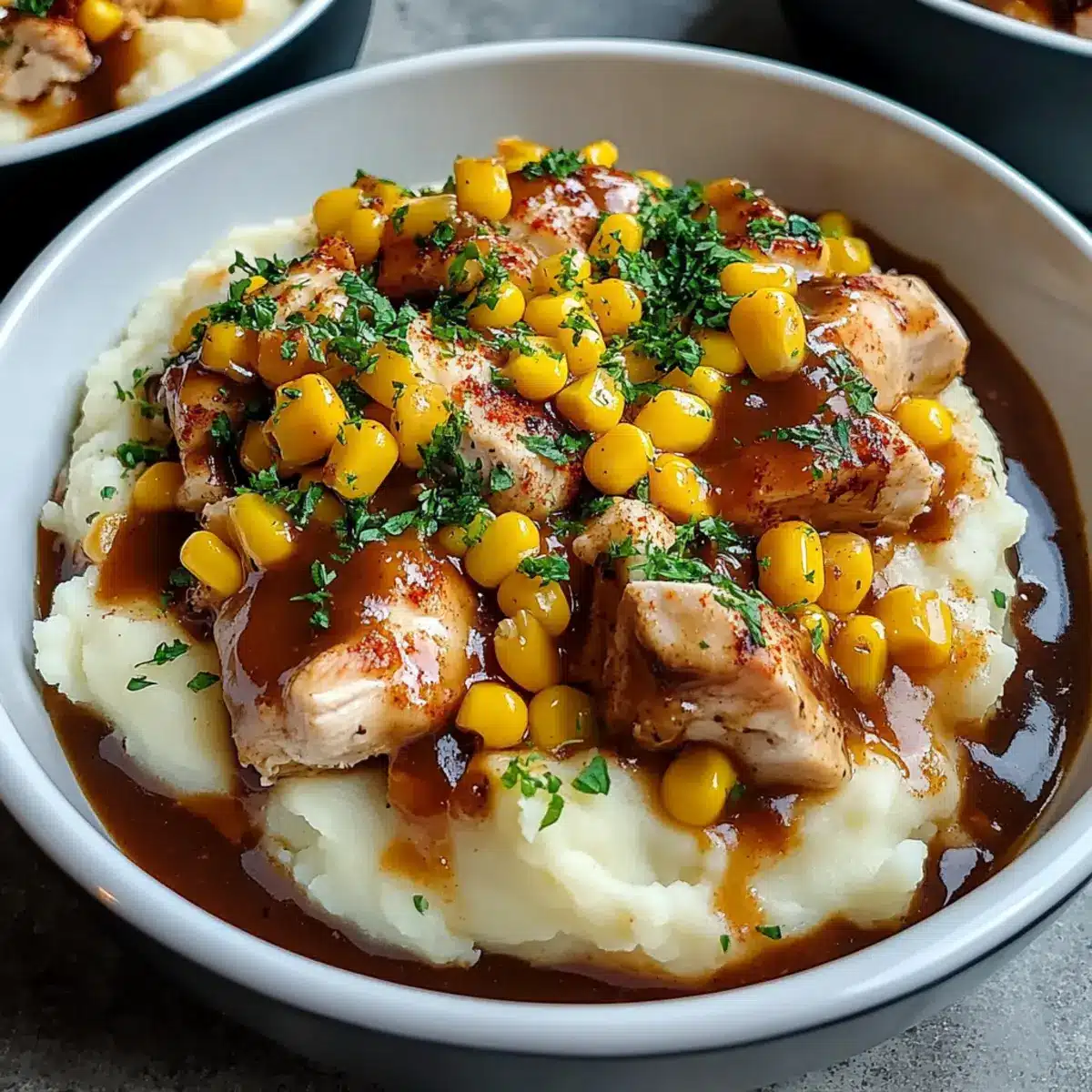 With all components in place, take your warm gravy and generously drizzle it over the assembled chicken and corn, allowing it to soak in beautifully. The rich gravy not only adds flavor but also enhances the visual appeal of your Chicken Mashed Potato Bowls, making it look as delicious as it tastes.