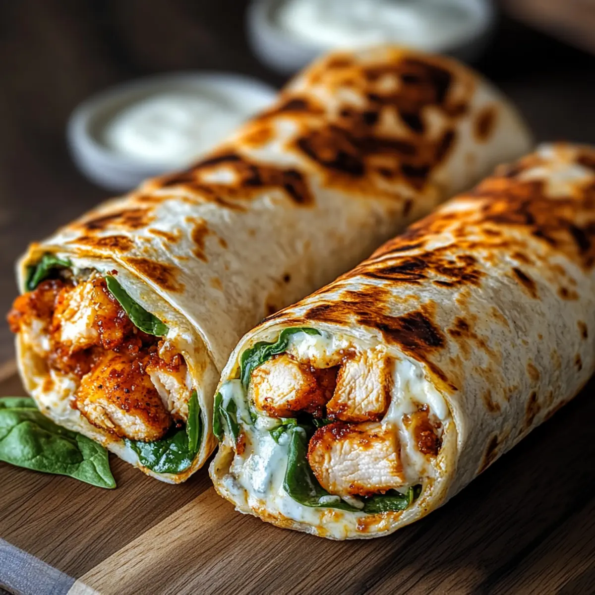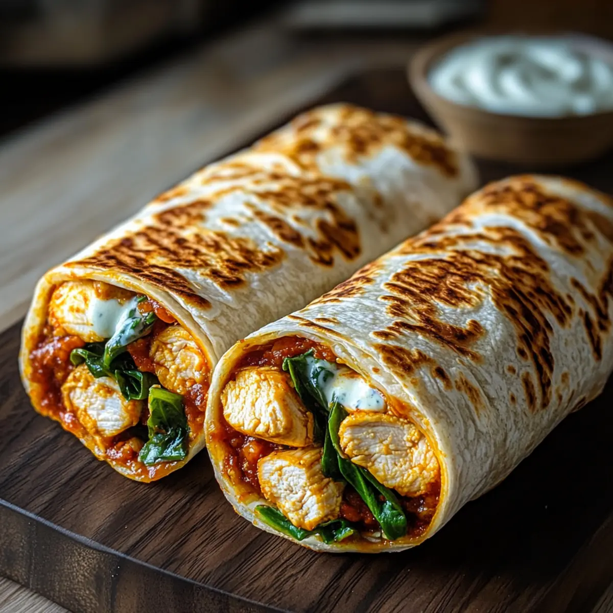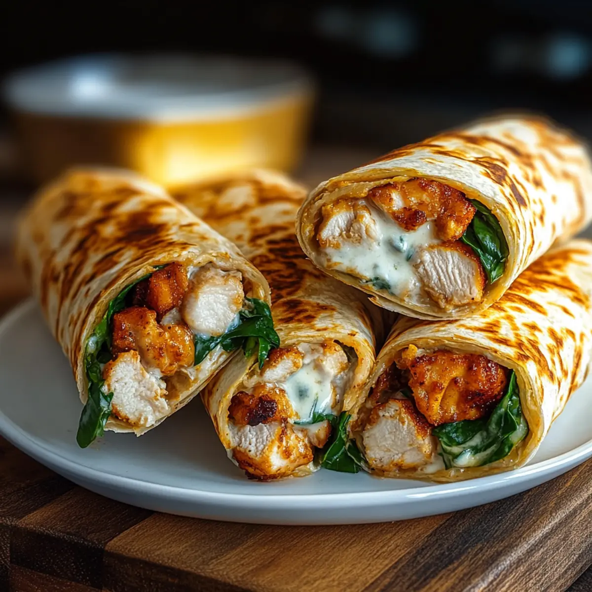 - Assemble the Wraps: Lay tortillas, add spinach, chicken strips, and mozzarella, then roll tightly.
