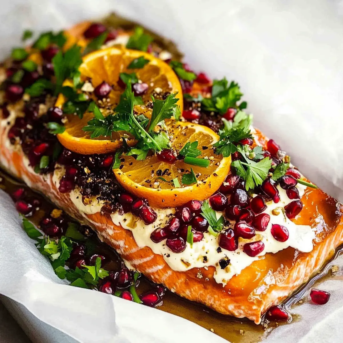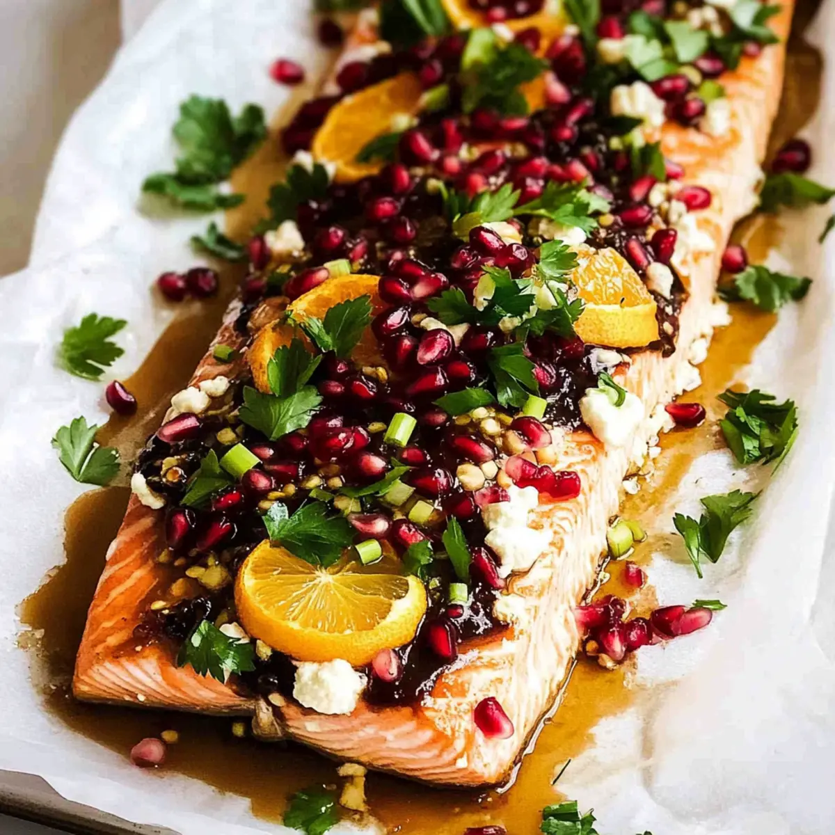 Once your Christmas Citrus Pomegranate Baked Salmon is finished baking, remove it from the oven and let it rest for a couple of minutes. For a stunning finish, garnish with fresh parsley, green onions, and pomegranate seeds to add a pop of color and crunch. Finally, drizzle any remaining glaze over the top before slicing and serving this festive dish to your delighted guests.