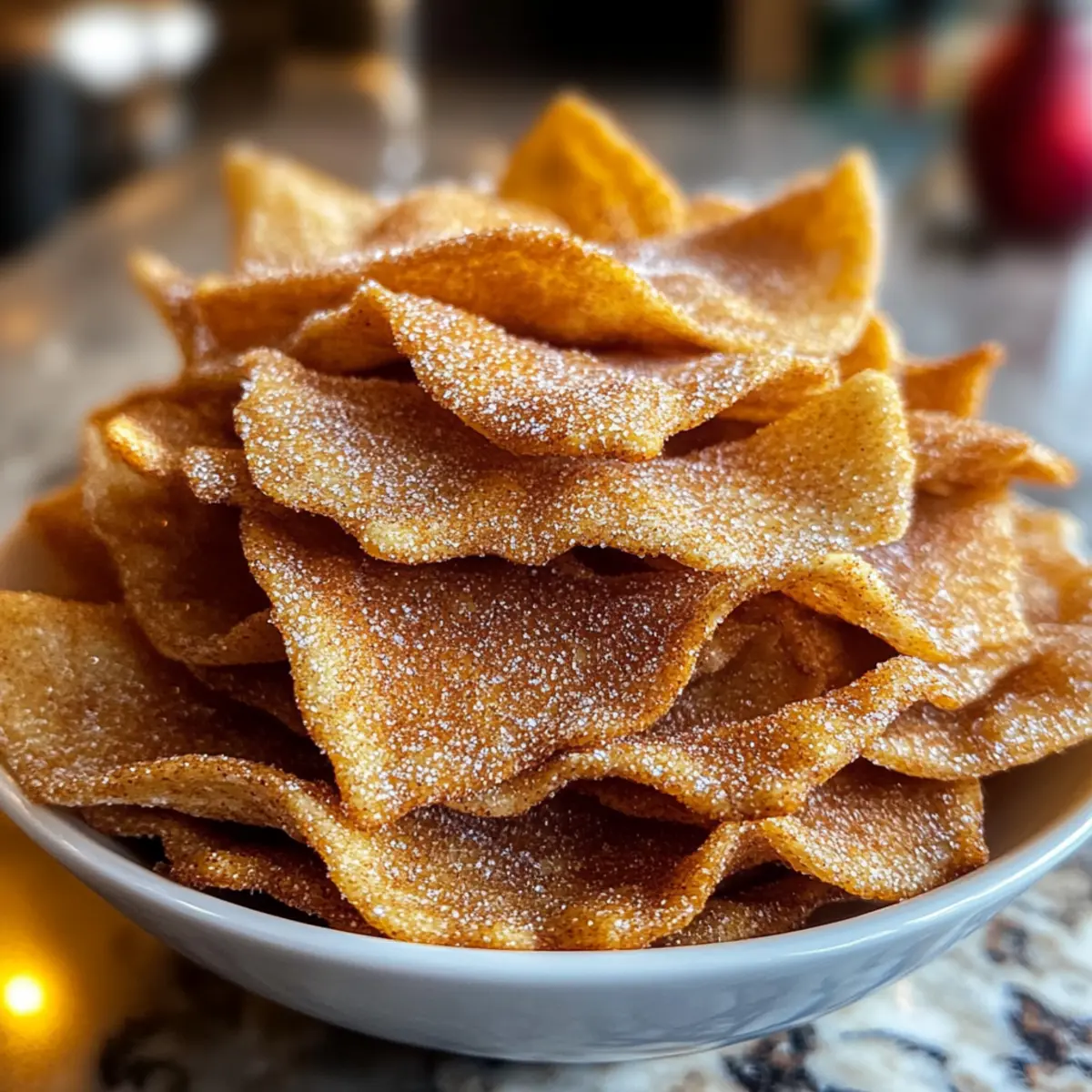 These Christmas Eve Cinnamon Crisps are a fantastic choice for busy home cooks looking to streamline holiday preparations! You can prepare the tortilla pieces and coat them with the cinnamon-sugar mixture up to 24 hours in advance. Simply store them in an airtight container at room temperature. When you’re ready to bake, preheat your oven and arrange the prepped pieces on a baking sheet as directed. Bake for about 10-12 minutes until golden brown, allowing the warm, fragrant aroma to fill your home. This way, you’ll have delicious, homemade treats ready with minimal effort, perfect for unexpected guests or holiday gatherings without sacrificing quality!