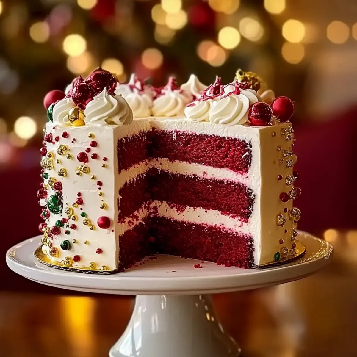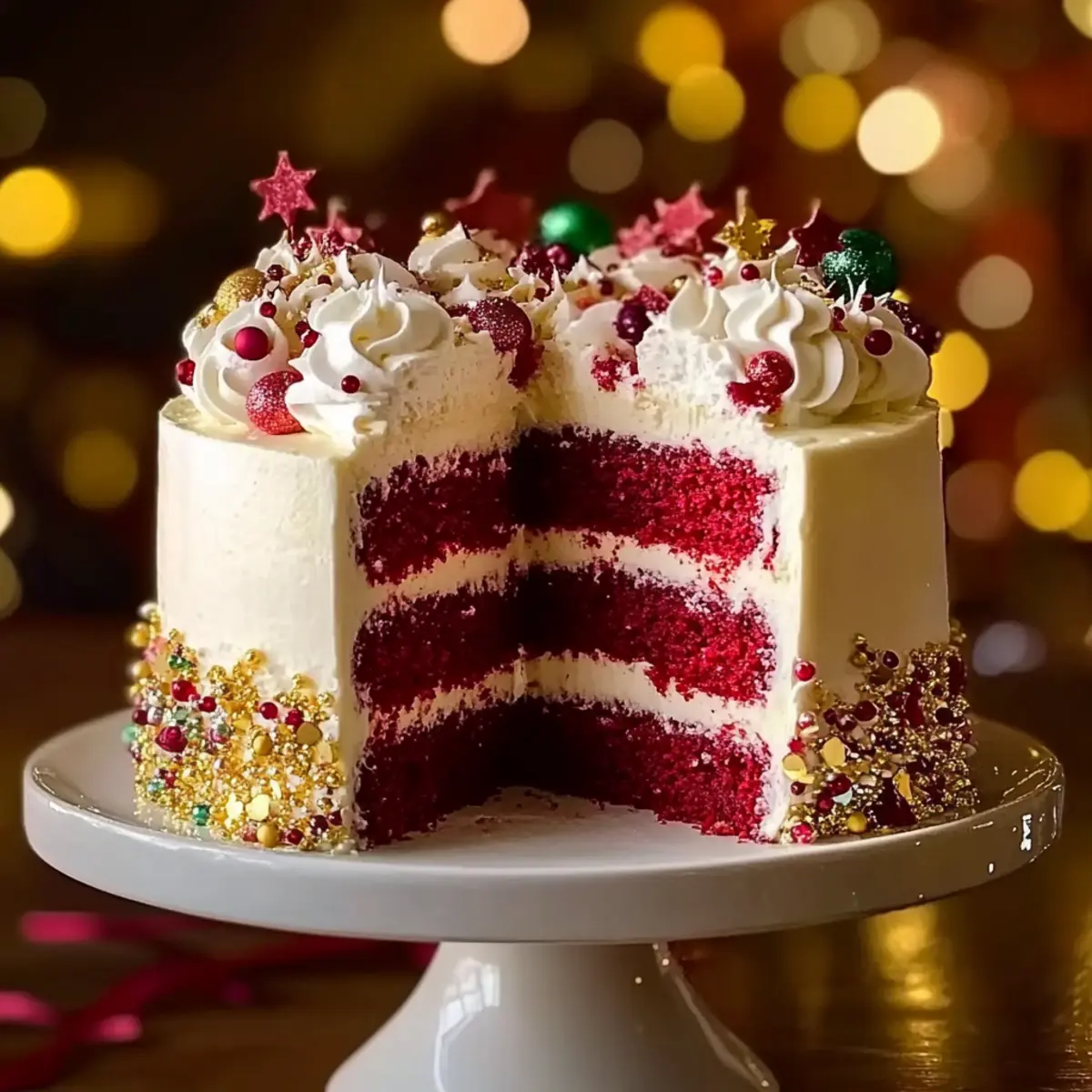 Prepare the cream cheese frosting by beating together 8 ounces of softened cream cheese, ½ cup of unsalted butter, and 2 cups of powdered sugar until creamy and smooth. Frost the top and sides of the stacked Christmas Red Velvet Cheesecake generously. Refrigerate the assembled cake for at least 4 hours, allowing it to set before decorating or serving to your guests.