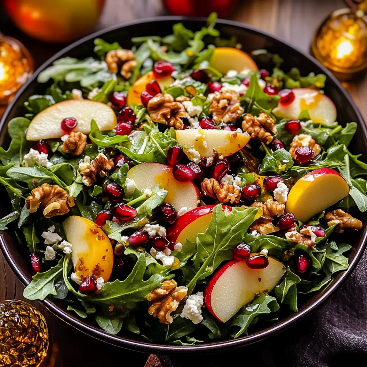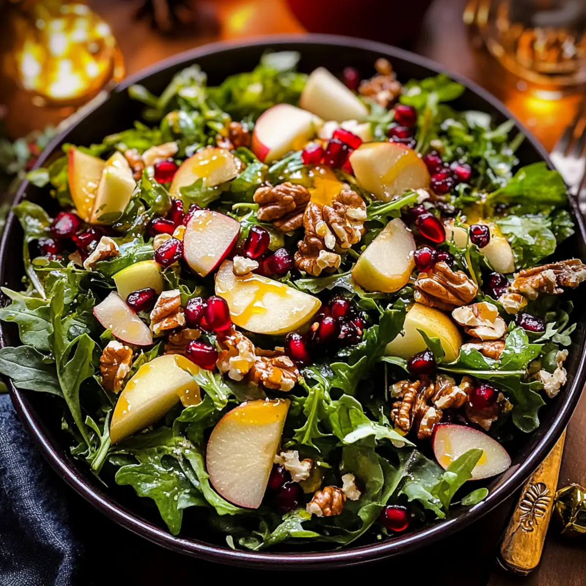 Vibrant Colors: This salad is a feast for the eyes with its rich greens, red pomegranate seeds, and crisp apple slices, making it a stunning centerpiece for your holiday table.