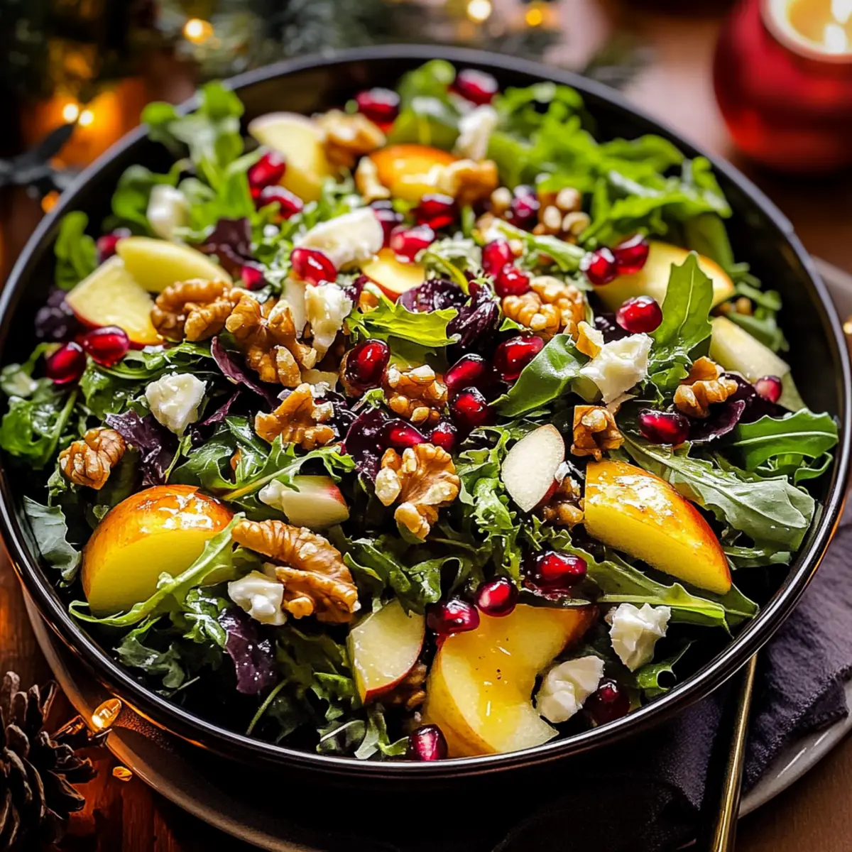 Next, slice 2 crisp apples into thin wedges and scatter them atop the greens. Sprinkle with 1 cup of pomegranate seeds, ensuring even distribution for bursts of juicy flavor. As you layer, the bright colors will enhance the festive appeal of the salad, making it visually striking for your holiday table.
