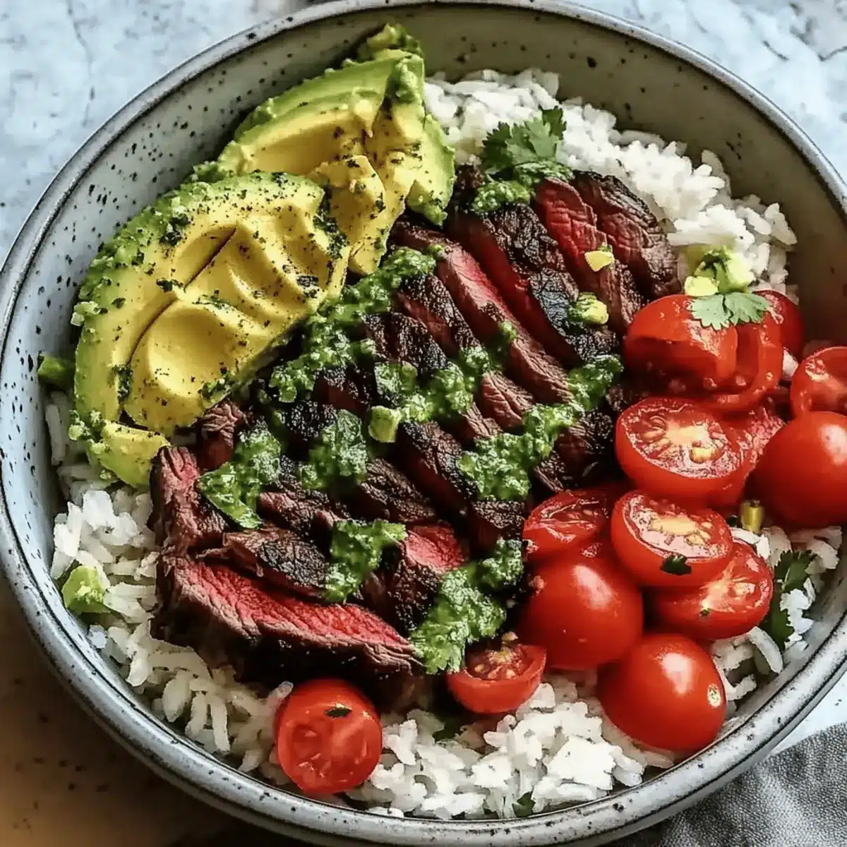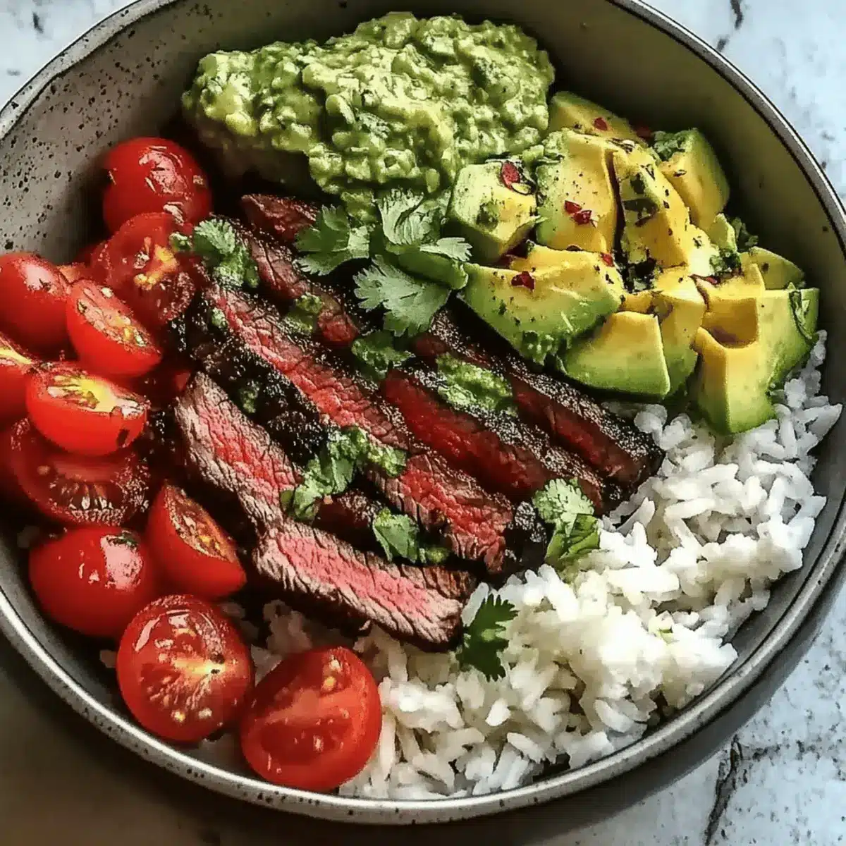 In serving bowls, start by adding a generous portion of cooked rice as the foundation. Layer with warmed black beans, sweet corn, diced cherry tomatoes, and creamy avocado slices. Top with the beautifully sliced steak and, if desired, sprinkle feta cheese and extra cilantro for garnish. Finish with lime wedges on the side for that extra zing!