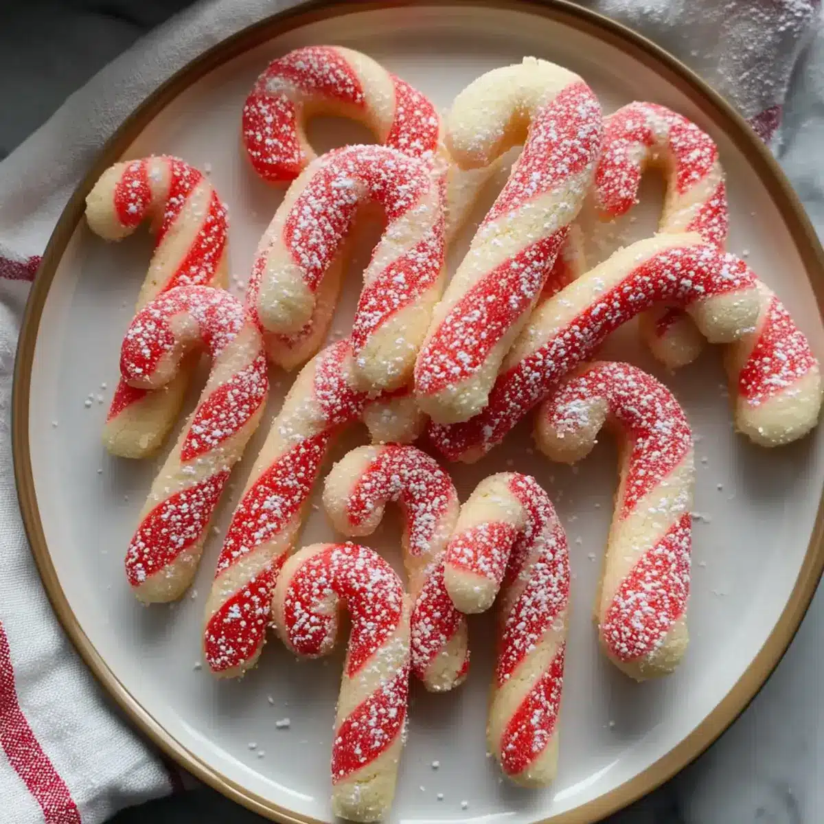 Sparkling Sugar Candy Canes: Before baking, roll the cookie shapes in coarse sparkling sugar for a glittery finish. This vibrant touch not only makes them eye-catching but also deliciously crunchy!