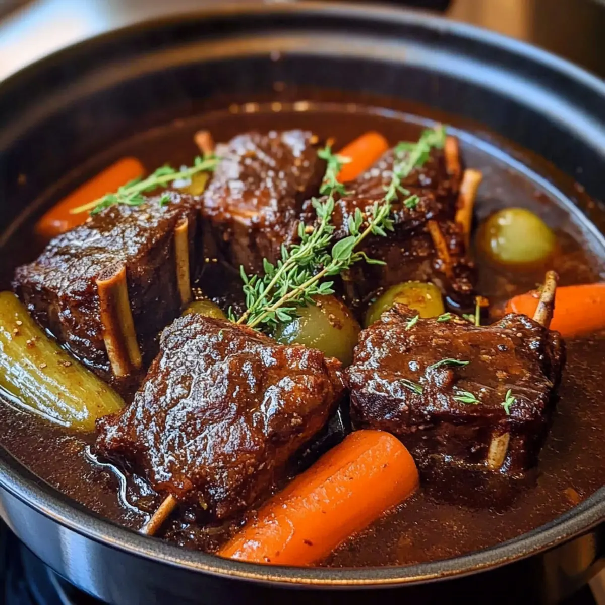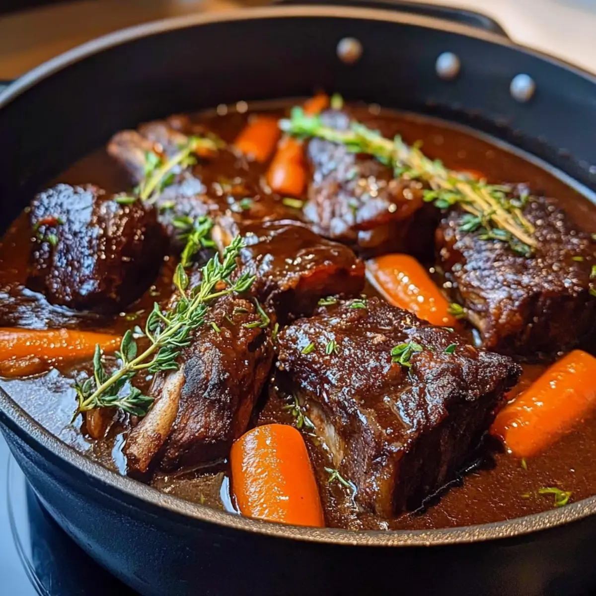 - In a large Dutch oven, heat olive oil over medium-high heat and sear the ribs on all sides for about 3–4 minutes each.