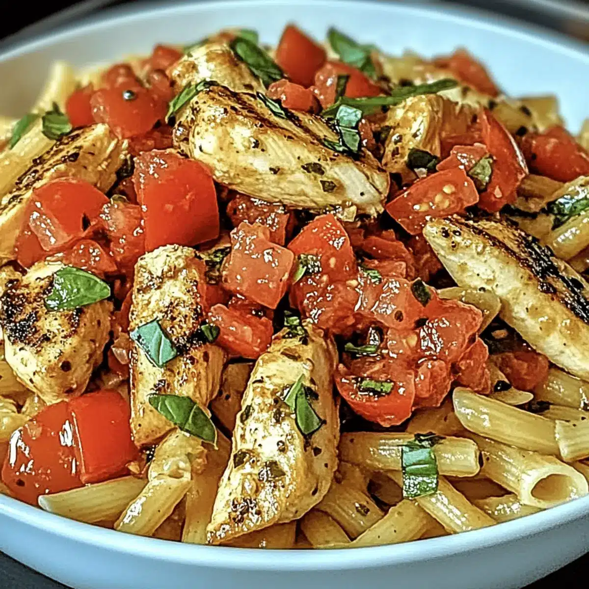 - Add the drained pasta to the skillet and toss with the bruschetta mixture until evenly coated. Plate the pasta, top with sliced chicken, and garnish with Parmesan cheese and torn basil.
