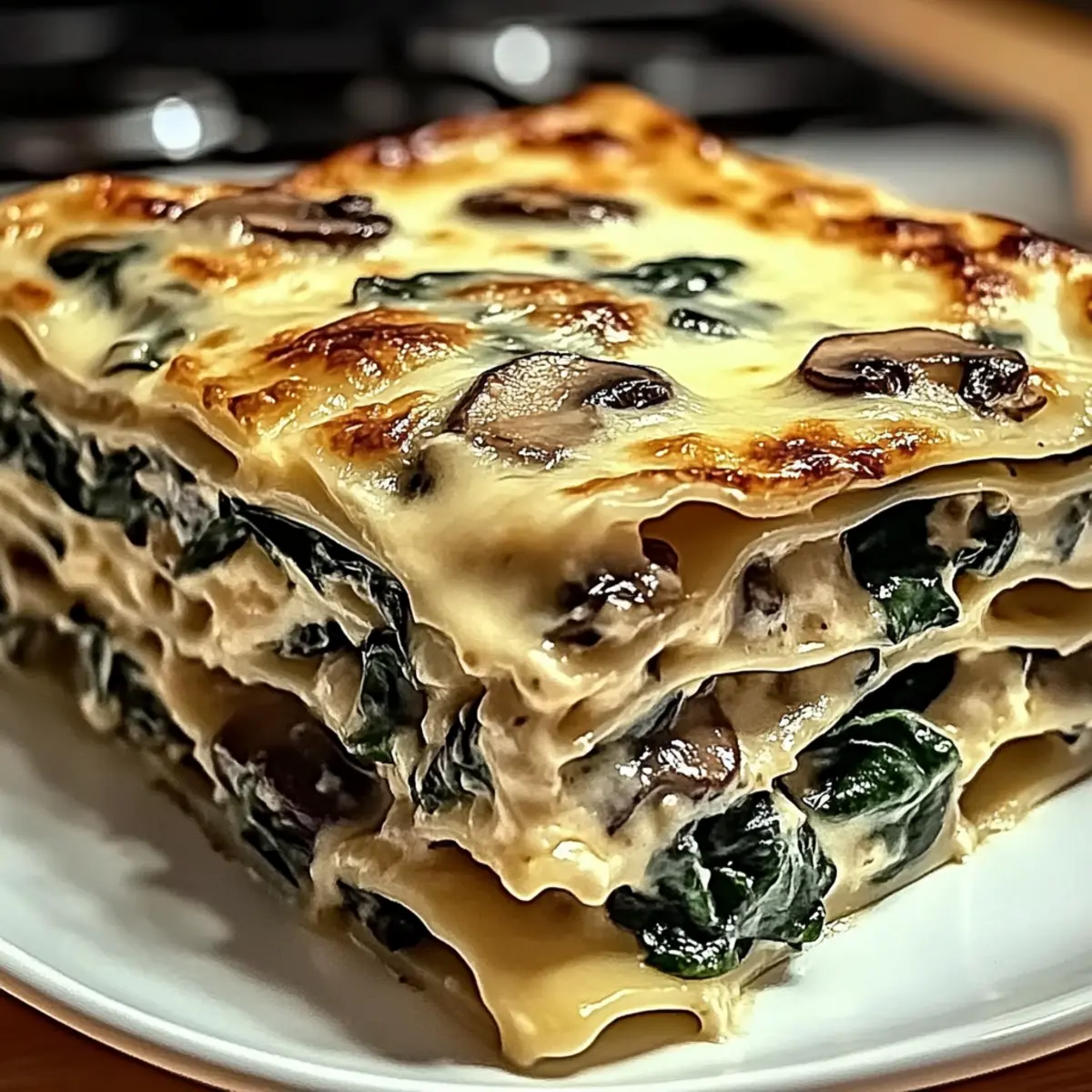 Comforting Layers: Each slice of this lasagna delivers a cozy experience, combining creamy béchamel with earthy mushrooms and vibrant spinach.