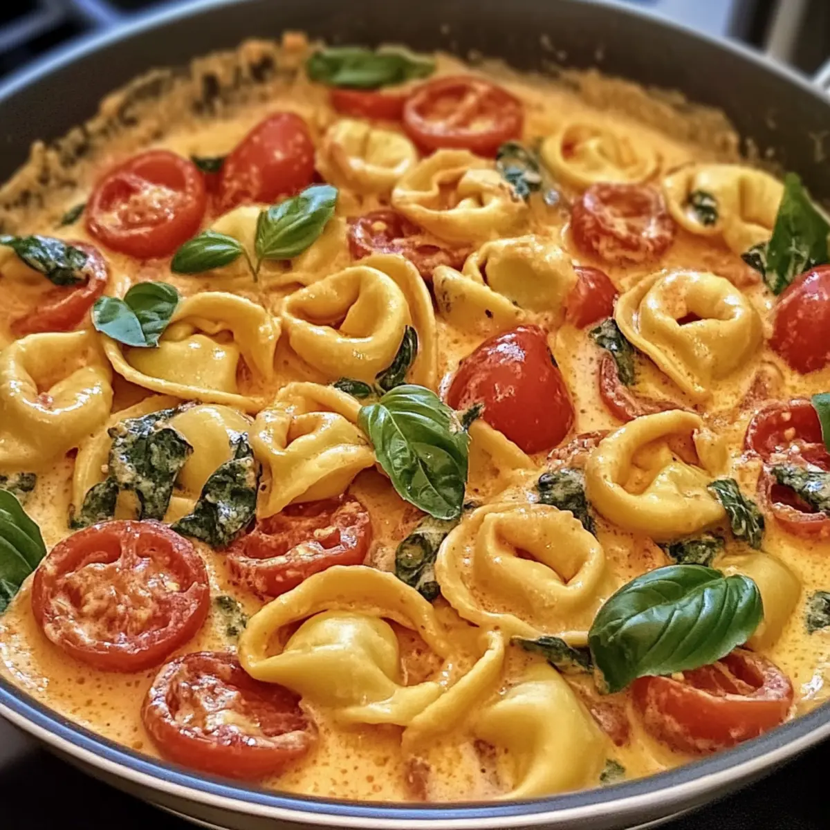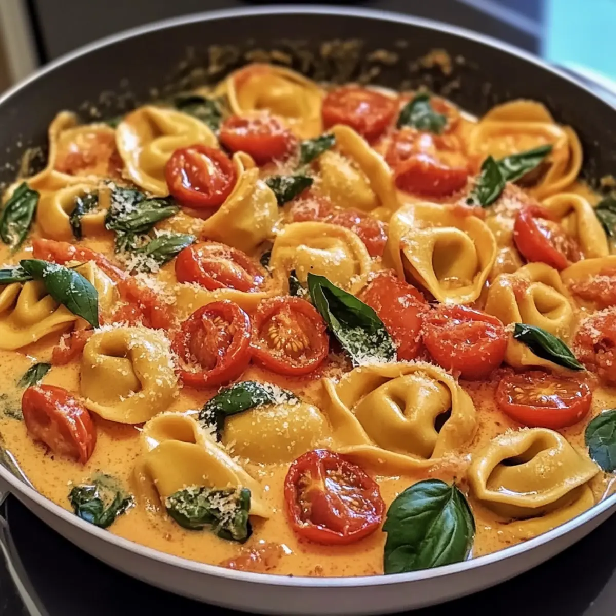 - Serve your delightful one-pan creamy tomato tortellini garnished with additional Parmesan and fresh basil if desired.