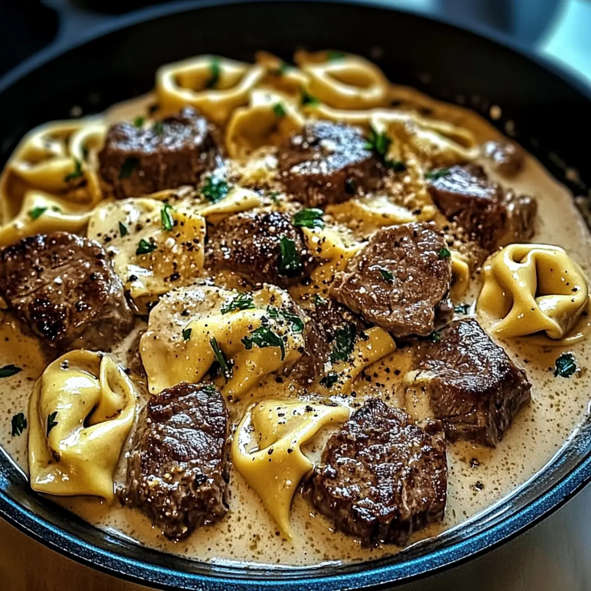 - Add sliced steak and cooked tortellini to the skillet, tossing to coat with the sauce. Cook for an additional 2 minutes.