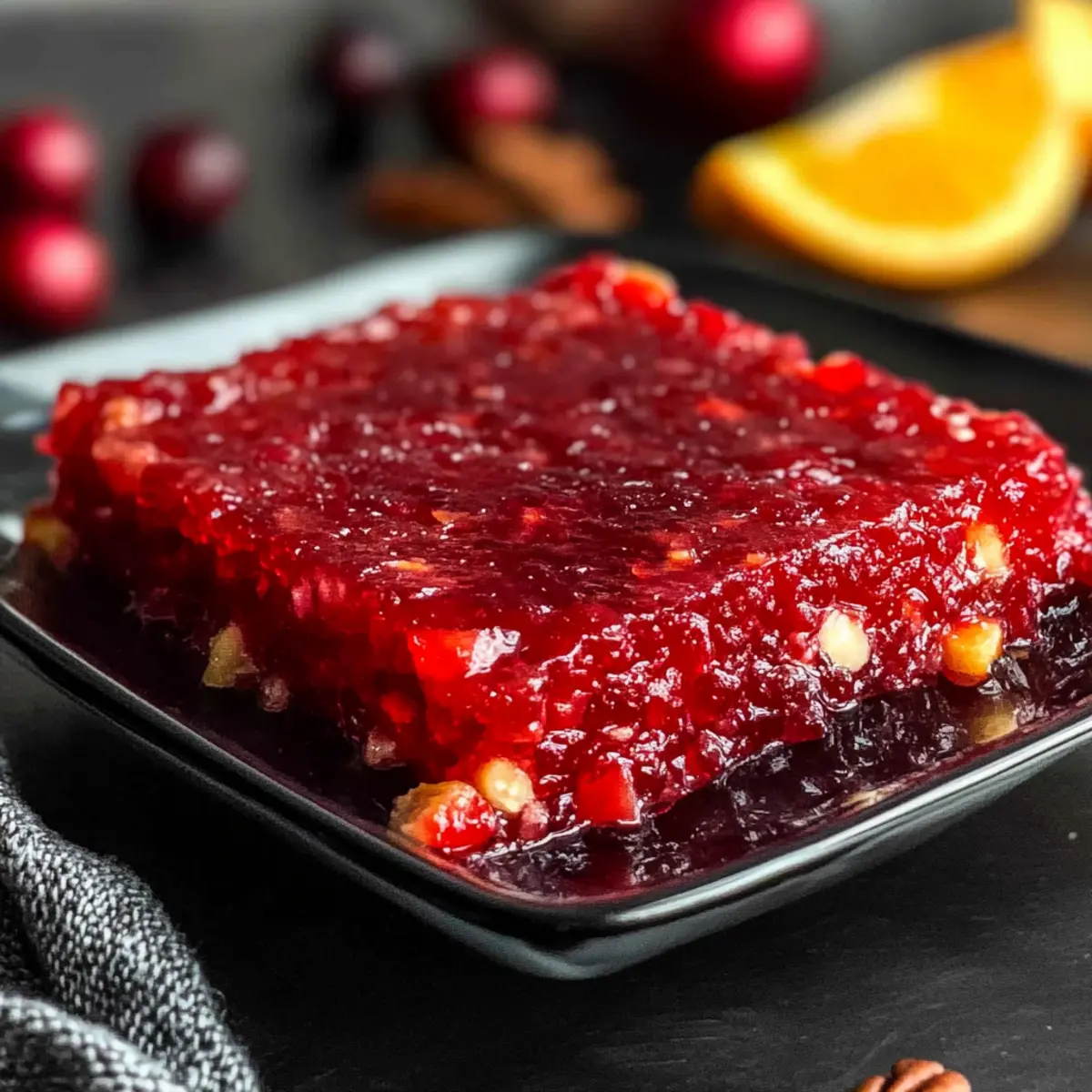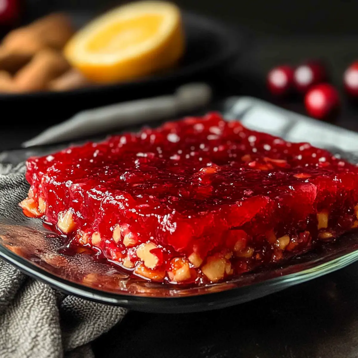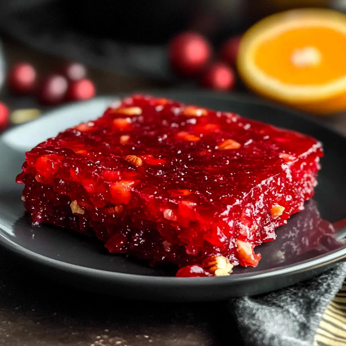 Vibrant Colors: This Cranberry Jello Salad dazzles on any holiday table with its bright hues of red and orange, making it an eye-catching centerpiece.