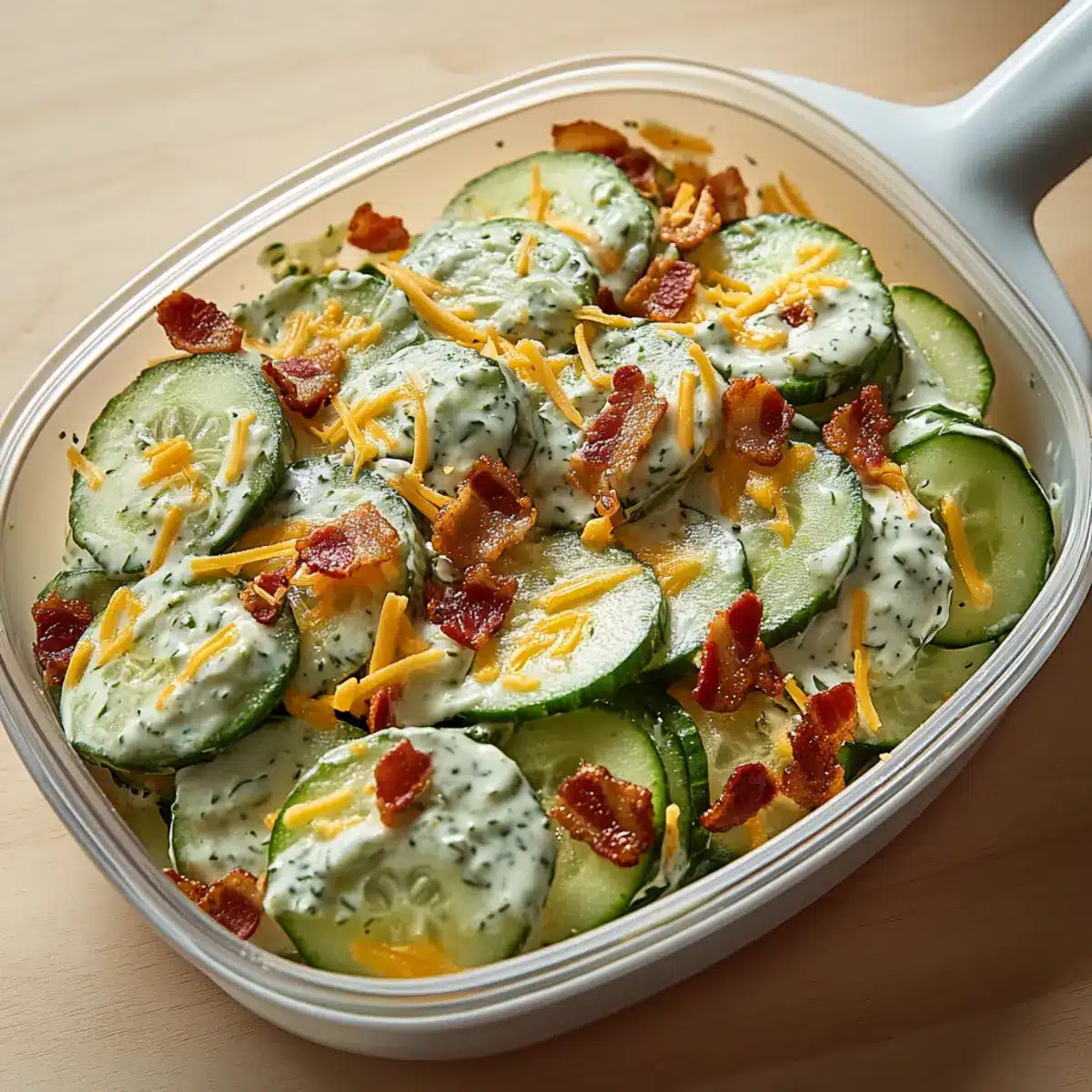 Take your avocado lime ranch dressing and drizzle it generously over the prepared toppings. Aim for a flavorful coating that seeps into the cheese and bacon, creating a delightful creamy texture. As you pour, watch the dressing create a beautiful swirl of colors across your vibrant Cucumber Snack base.