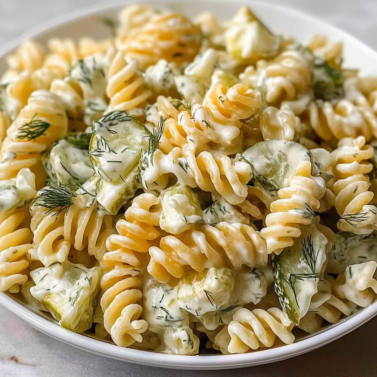 Irresistible Flavor: This pasta salad features the perfect balance of creamy and tangy, thanks to the addition of dill pickles and a zesty dressing.