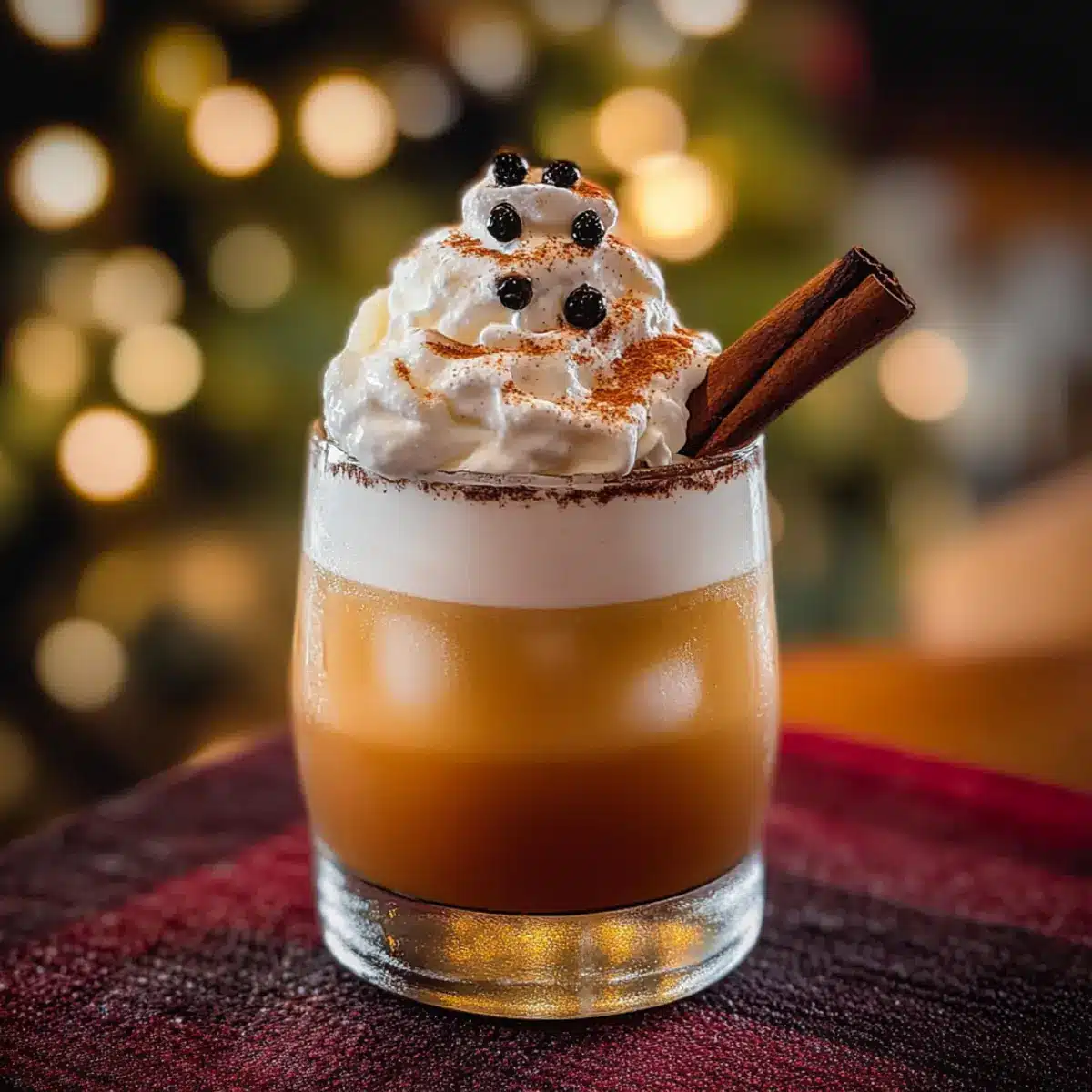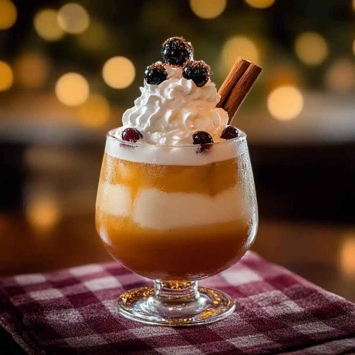 To create a lovely garnish, use whipped cream topped with a drizzle of chocolate syrup, plus a lightly charred cinnamon stick for that festive aroma. To char the cinnamon, hold it over an open flame for just a few seconds—this will enhance the scent without burning it! Enjoy your delicious creation!