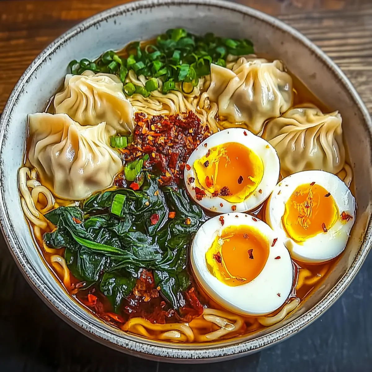 - Assemble the Bowls by dividing noodles, dumplings, and spinach into bowls, ladling broth, and topping with soft-boiled eggs and garnishes.