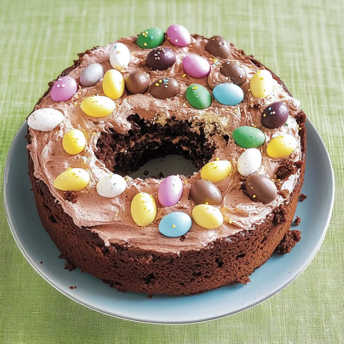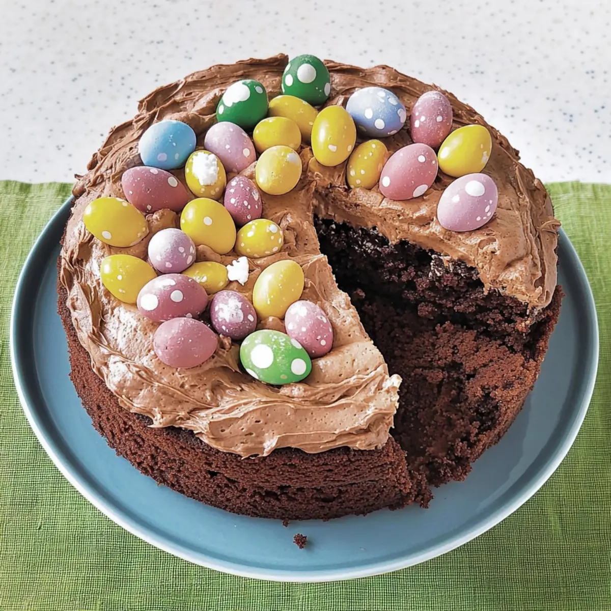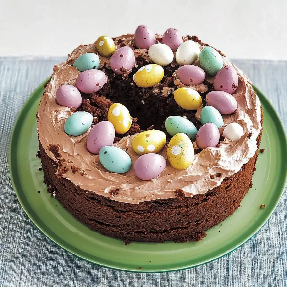 Once the cake has fully cooled, spread the whipped cream generously over the top. Arrange your mini chocolate eggs attractively on the cream, transforming your delightful creation into a festive centerpiece. Serve immediately or chill for a brief moment to set the cream. Now your Easter Egg Nest Cake is ready to be enjoyed at any gathering!
