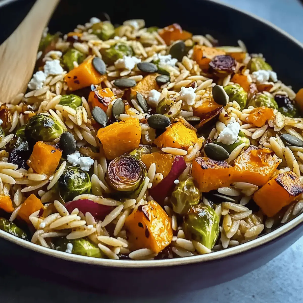These Fall Harvest Orzo Salad preparations are perfect for busy weeknights or gatherings! You can roast the butternut squash and Brussels sprouts up to 3 days in advance, letting them cool completely before refrigerating them in an airtight container to maintain their delightful texture. The orzo can be cooked 24 hours before serving; just remember to rinse it under cold water to prevent sticking. When you’re ready to enjoy this fresh and vibrant salad, simply combine all elements—the roasted veggies, orzo, and dressing—and toss them together. Finish with the crumbled goat cheese just before serving for a creamy touch and experience all the delicious flavors just as if they were freshly made!