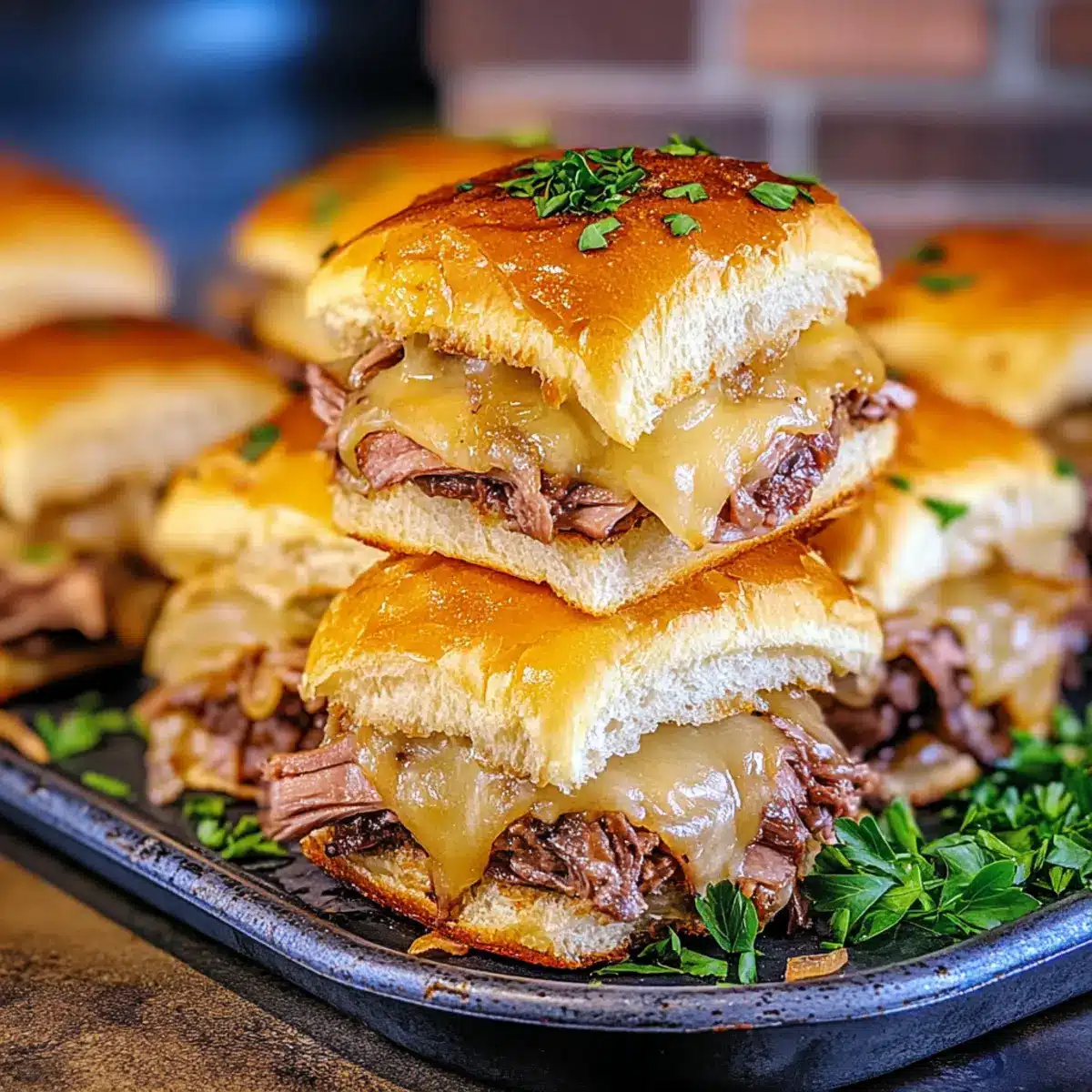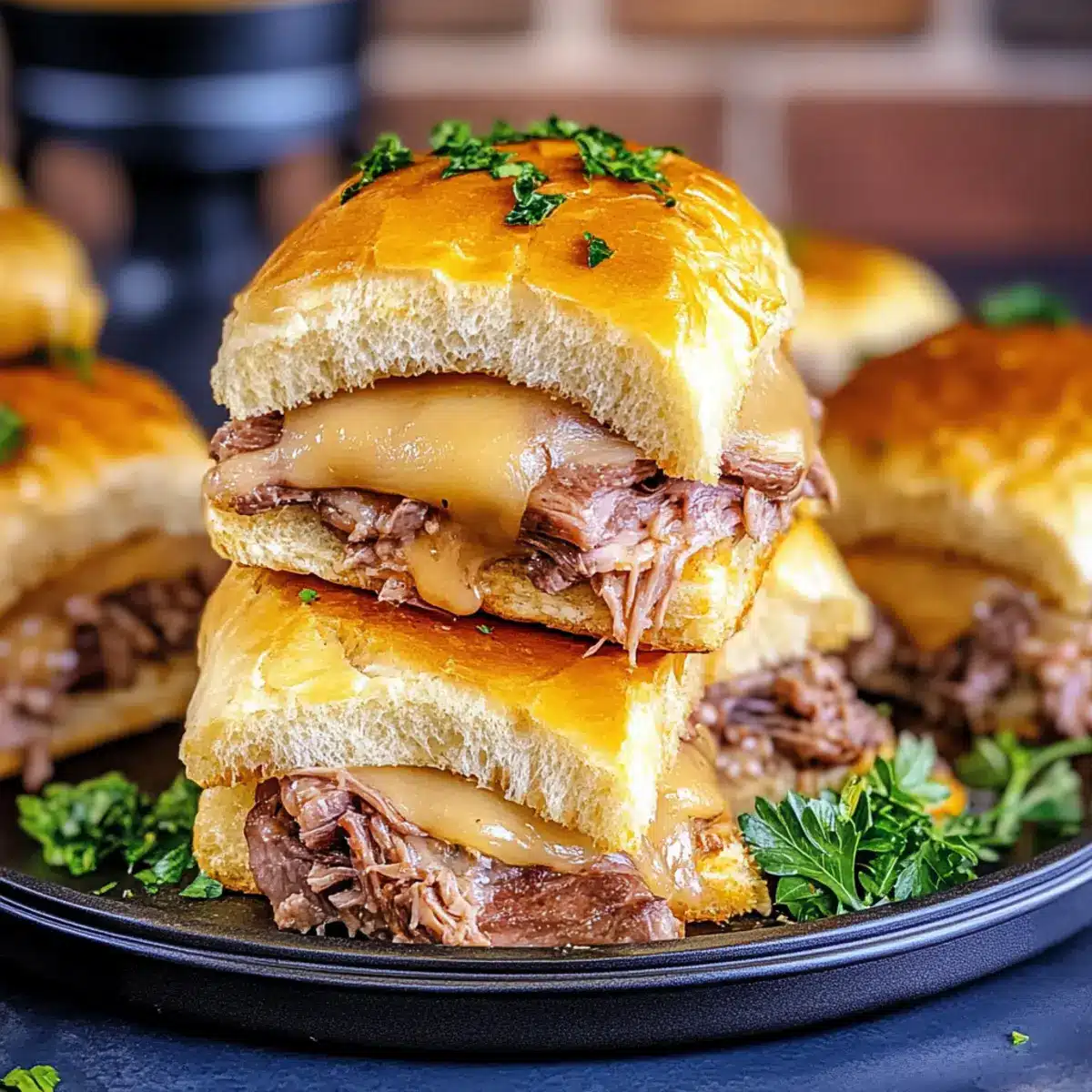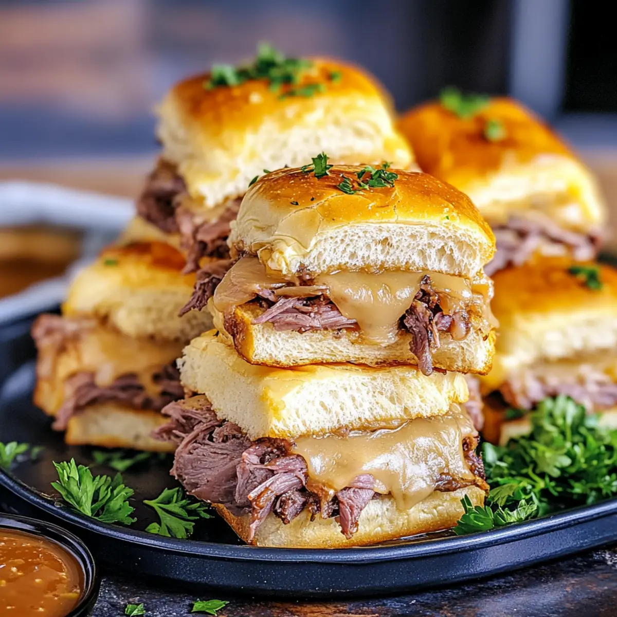 Once your French Dip Sliders are finished baking, take them out of the oven and let them cool for a couple of minutes. Garnish with freshly chopped parsley for a pop of color and added freshness. Serve the sliders warm alongside the au jus for dipping, inviting everyone to indulge in this delightful comfort food treat!