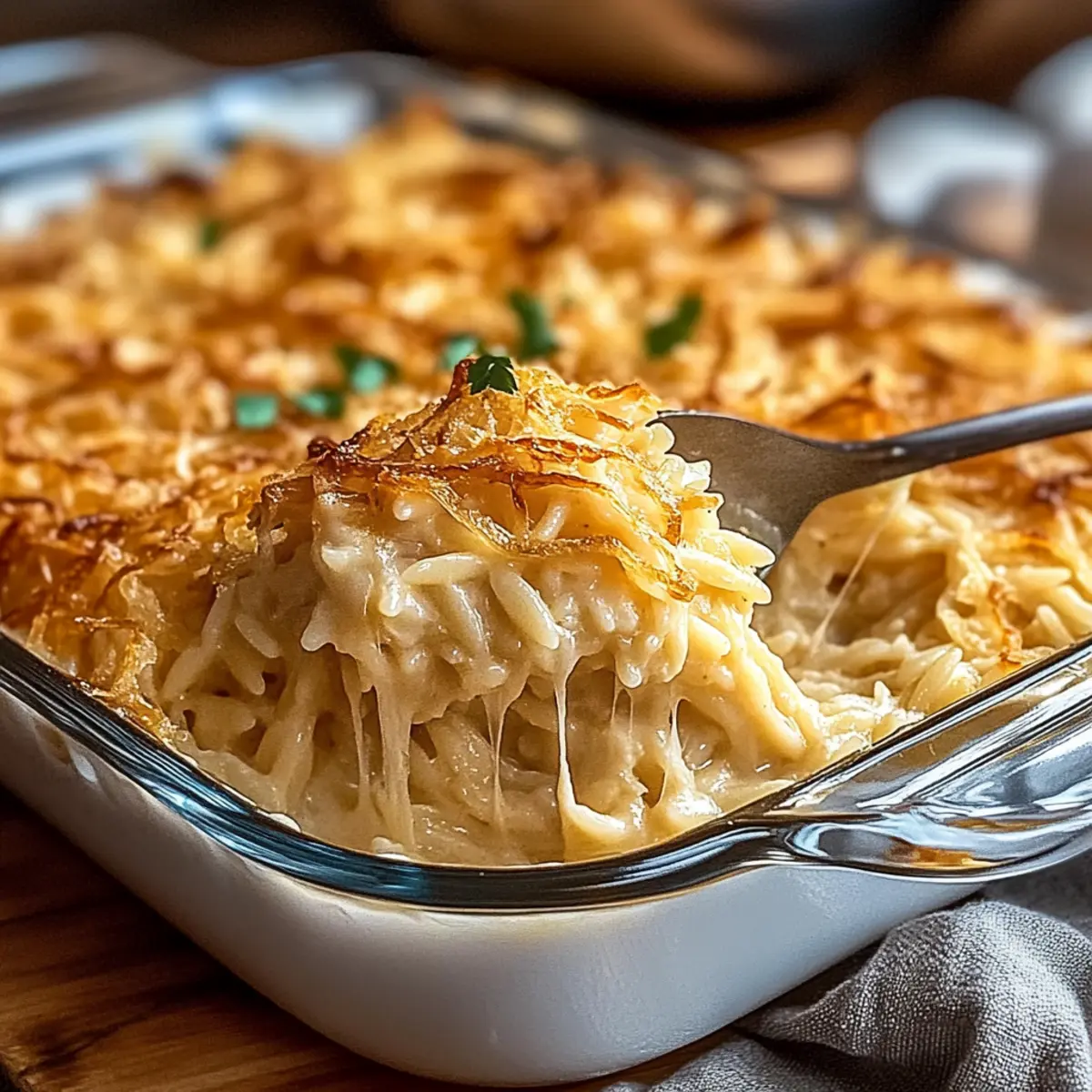 After baking, remove the skillet from the oven and let it cool for a few minutes to firm up. For a fresh finish, sprinkle chopped fresh parsley or chives on top. Serve the Creamy French Onion Orzo Bake warm, reveling in its comforting flavors, and enjoy every cheesy, delightful bite!