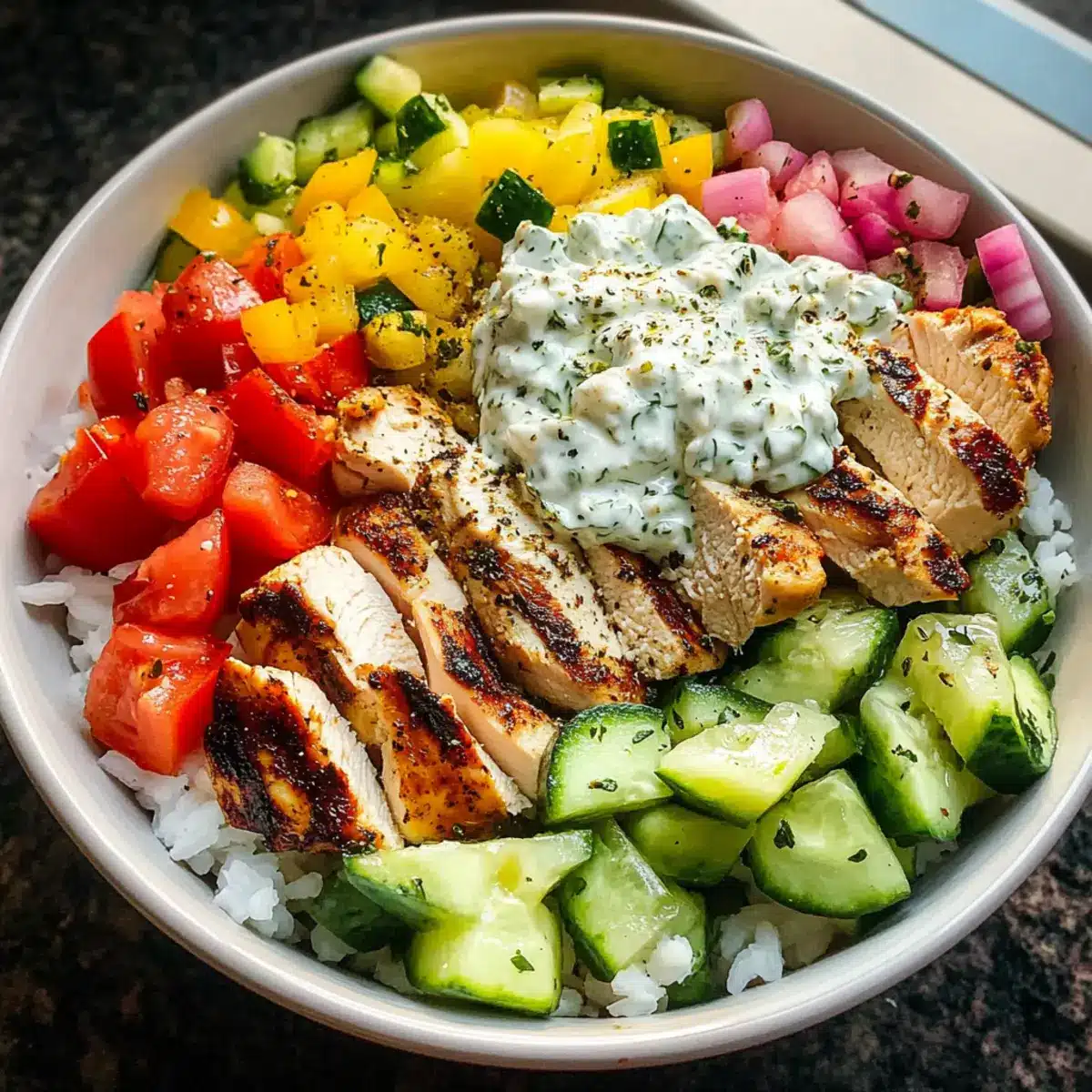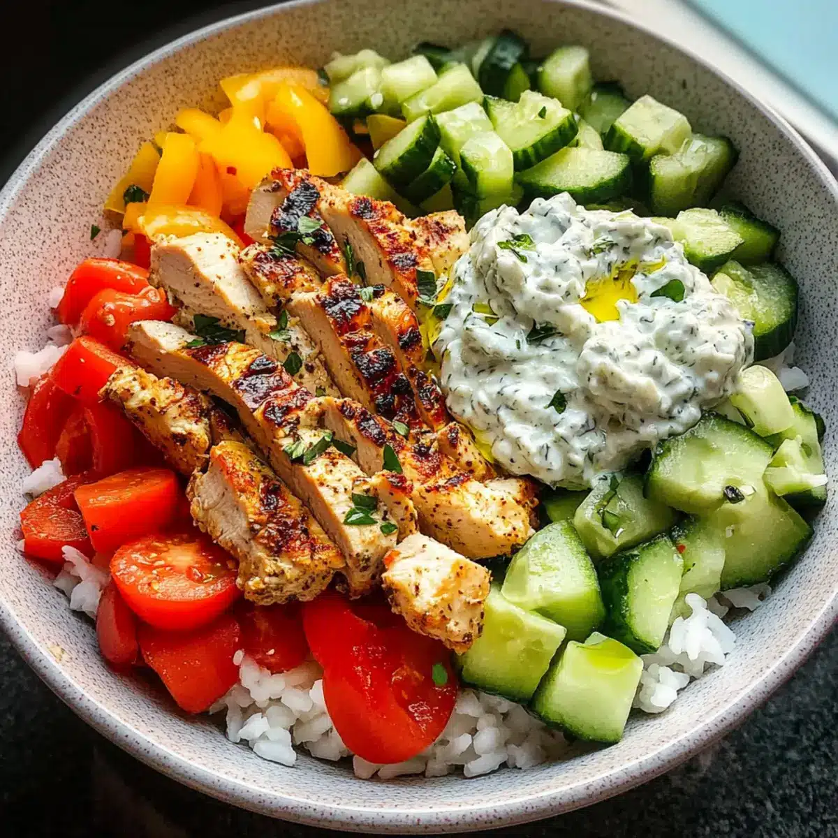 - Slice the cooked chicken and assemble the bowls with rice or quinoa, sliced cucumbers, diced tomatoes, and bell peppers topped with chicken and tzatziki.