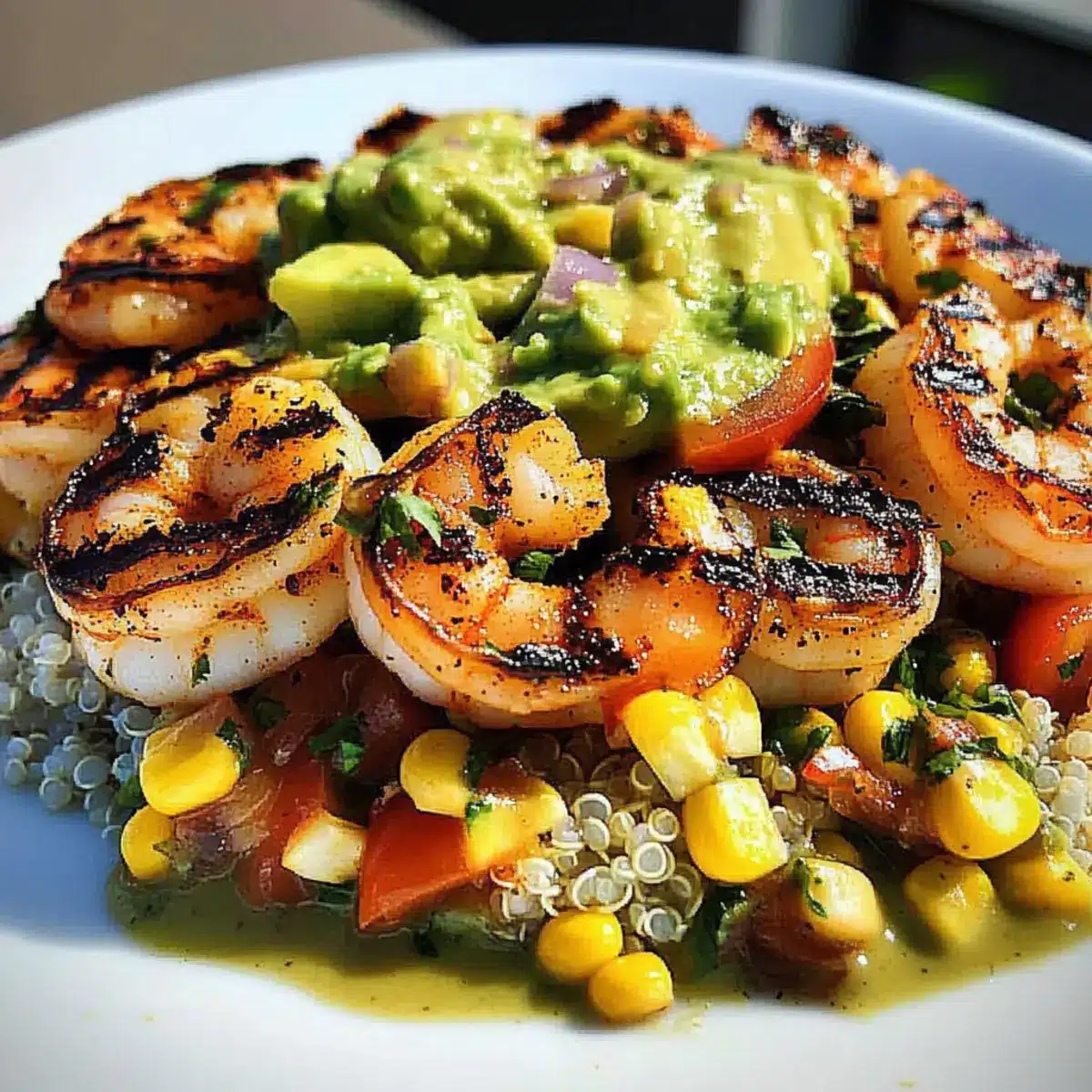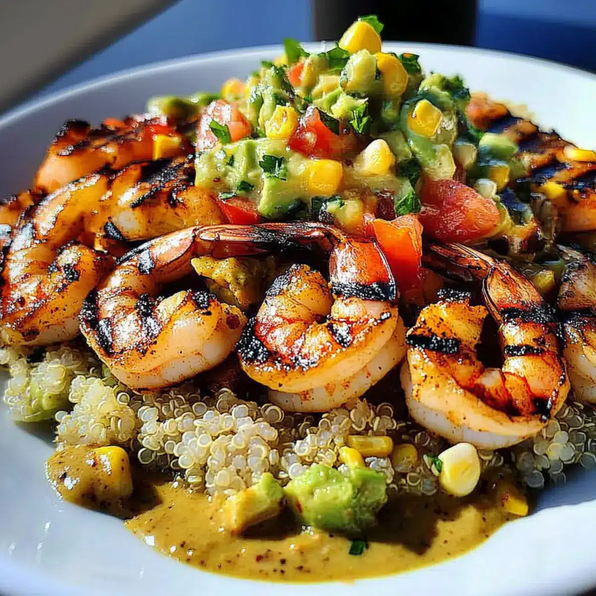 - Start with a base of pre-cooked rice or quinoa in your serving bowls. Layer the grilled shrimp on top, followed by the avocado corn salsa. Drizzle the creamy sauce over the bowl.