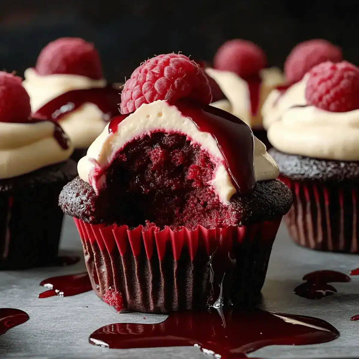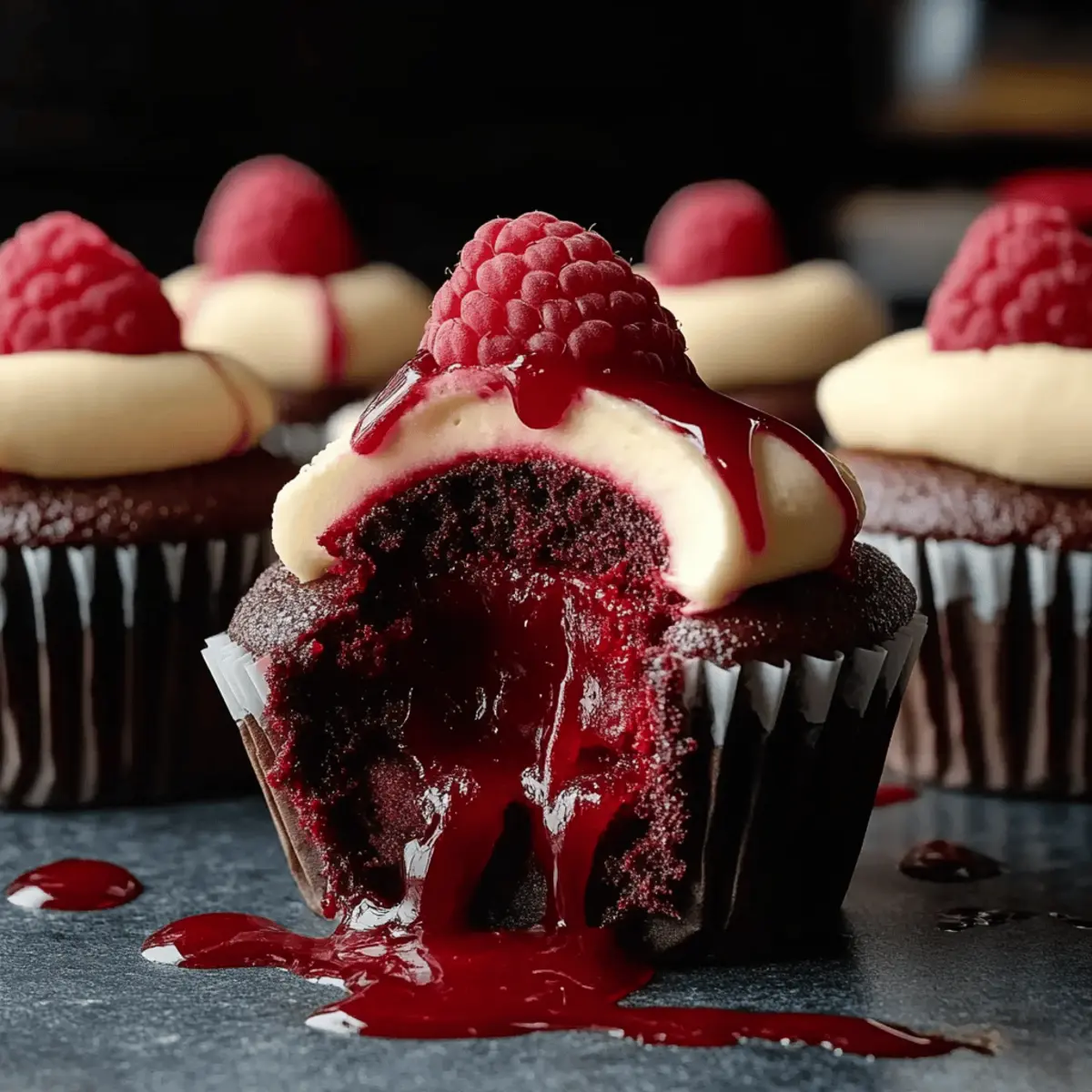 To finish, place fresh raspberries on top of each frosted cupcake for an extra festive look. These decorations not only enhance the appearance but also blend beautifully with the fruity flavor of the jam, making your Halloween Vampire Bite Cupcakes irresistible to your guests!