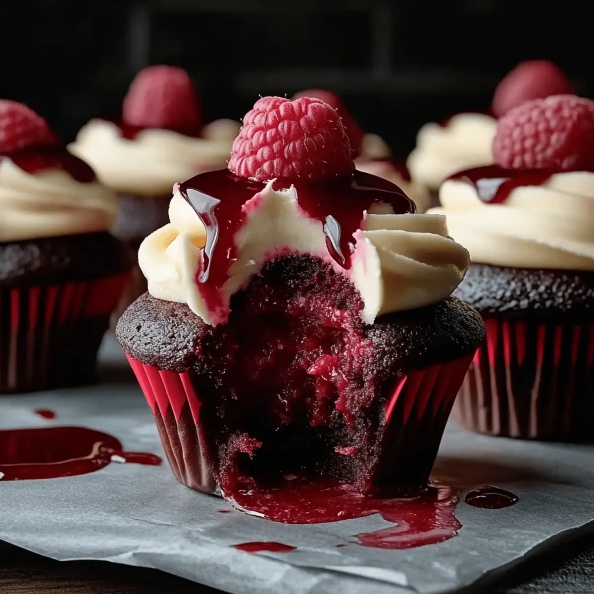 These Halloween Vampire Bite Cupcakes are perfect for busy home cooks looking to save time! You can bake the cupcakes up to 3 days in advance; simply let them cool completely and store them in an airtight container at room temperature. The jam filling can also be prepared 24 hours ahead by warming it up, cooling it down, and refrigerating it until ready to use. When you’re ready to serve, just core the cupcakes, fill them with the jam, frost them, and add a raspberry garnish for a delightful spooky treat. This way, you’ll have impressively festive cupcakes with minimal effort on the day of your celebration!