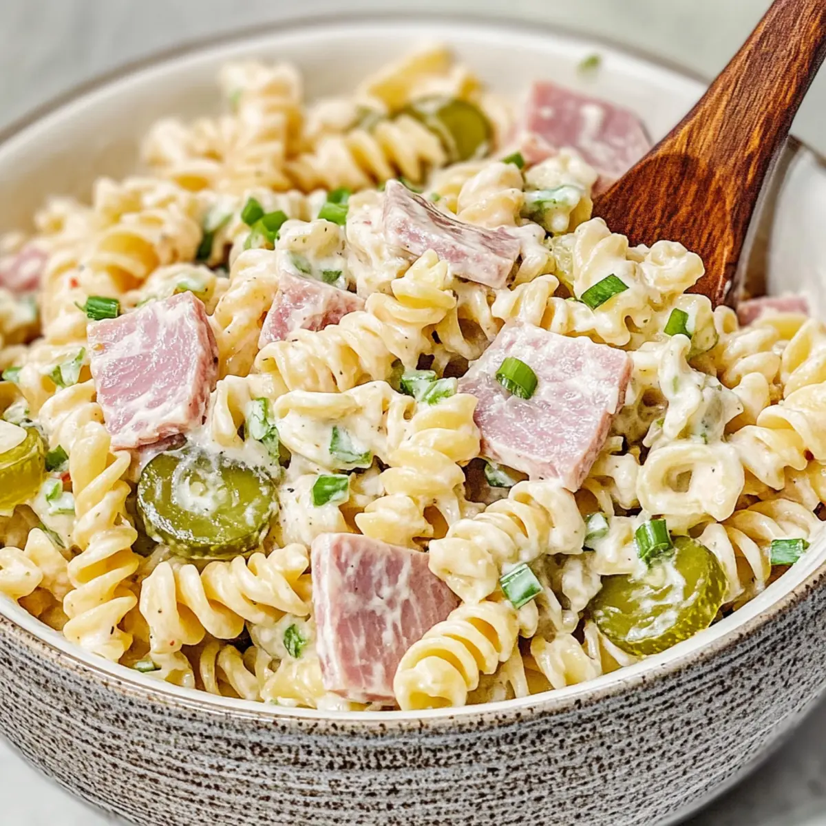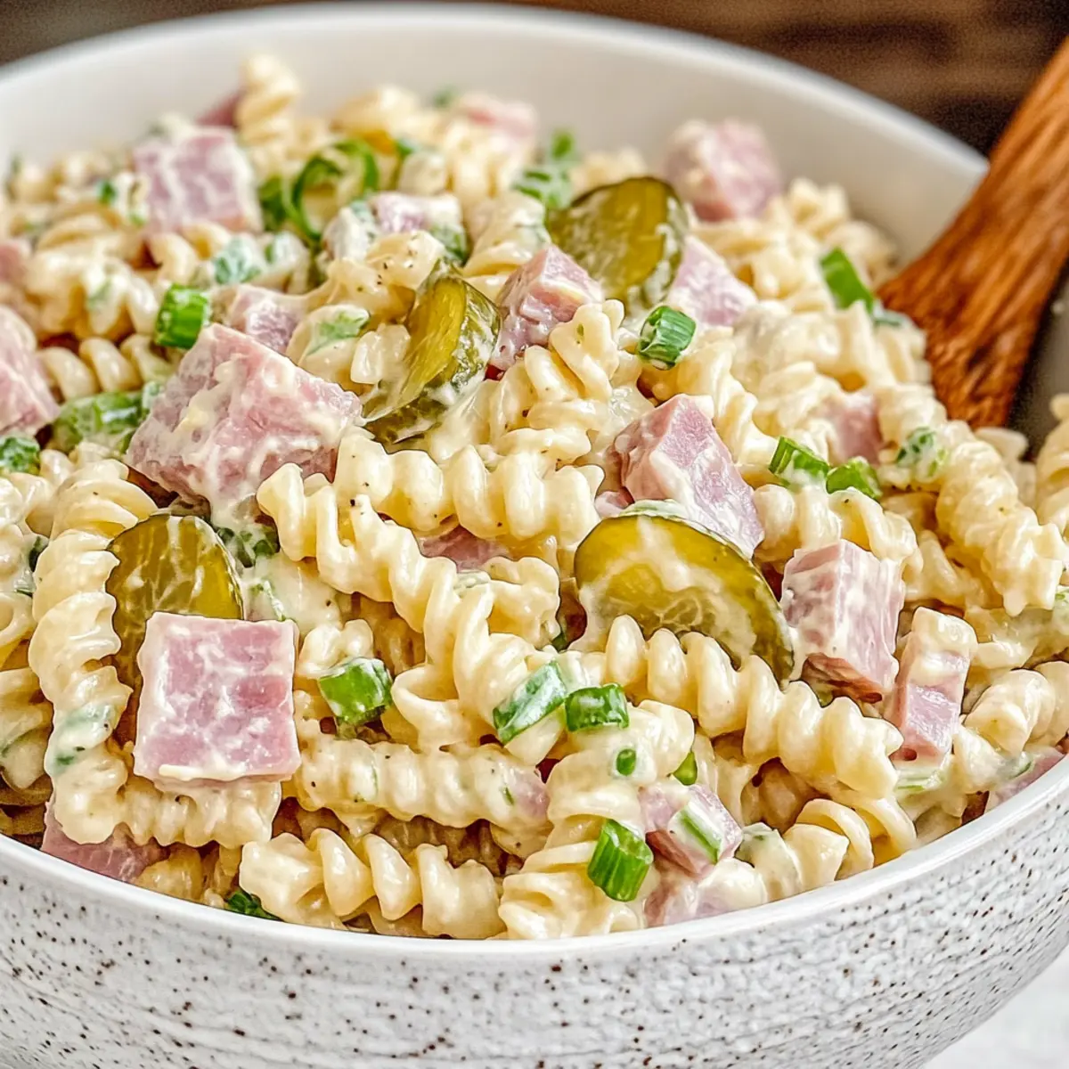 - In a large serving bowl, combine cooled pasta, chopped ham, diced dill pickles, and green onions. Toss gently.