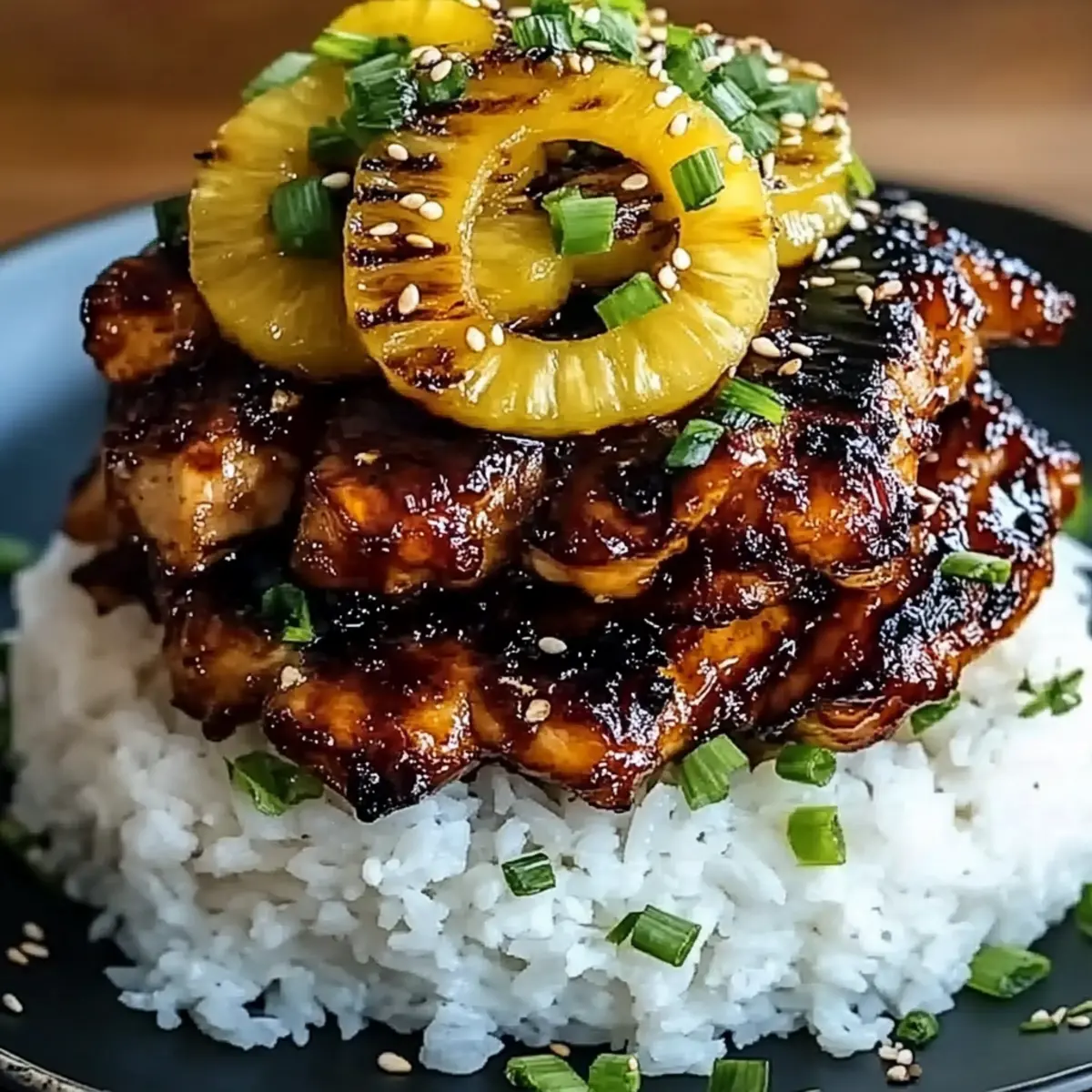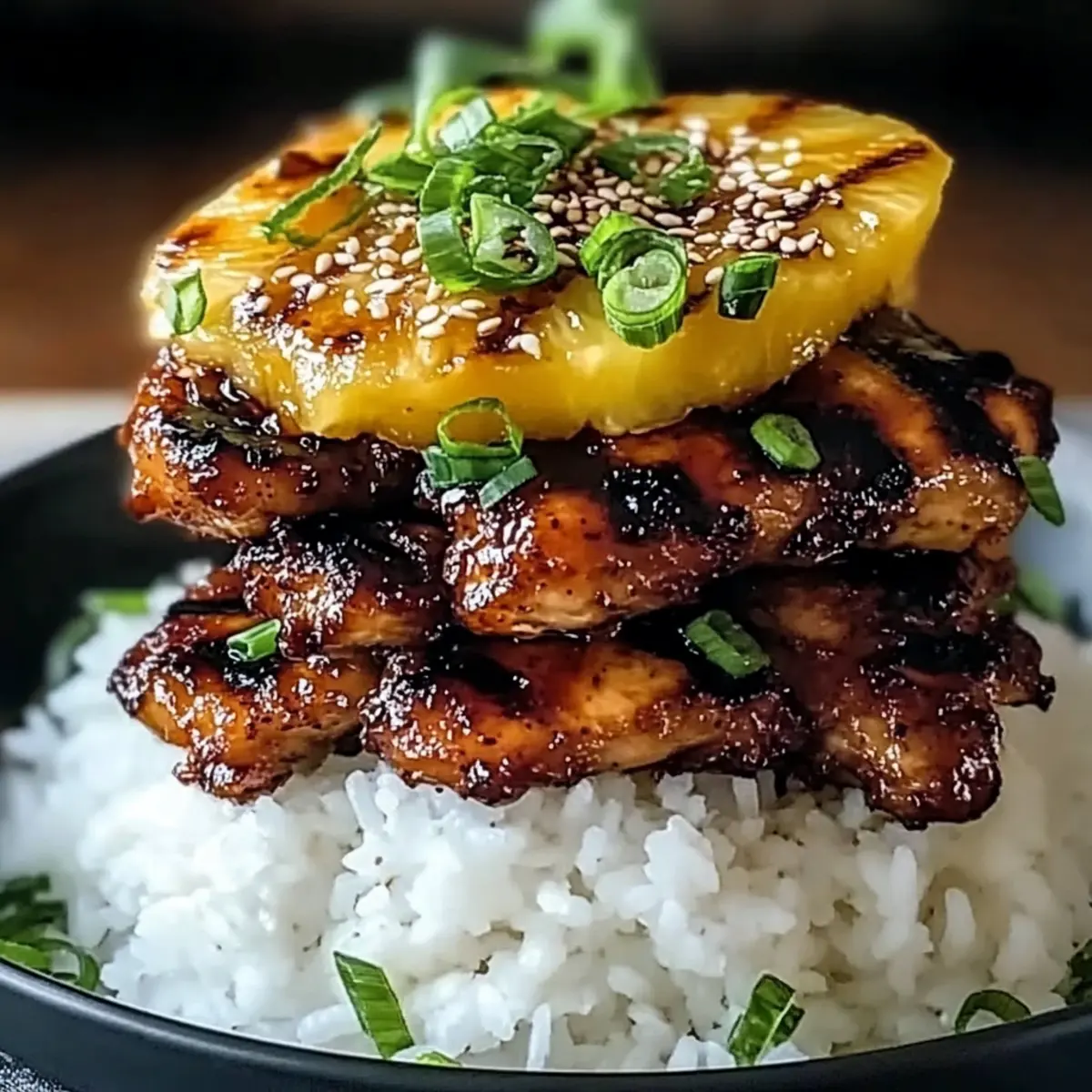 To serve, start with a generous spoonful of cooked white rice on each plate, creating a fluffy base. Layer the grilled chicken on top, followed by a slice of grilled pineapple. Drizzle over the thickened glaze for that final touch, then garnish with sliced green onions and sesame seeds for added color and crunch.