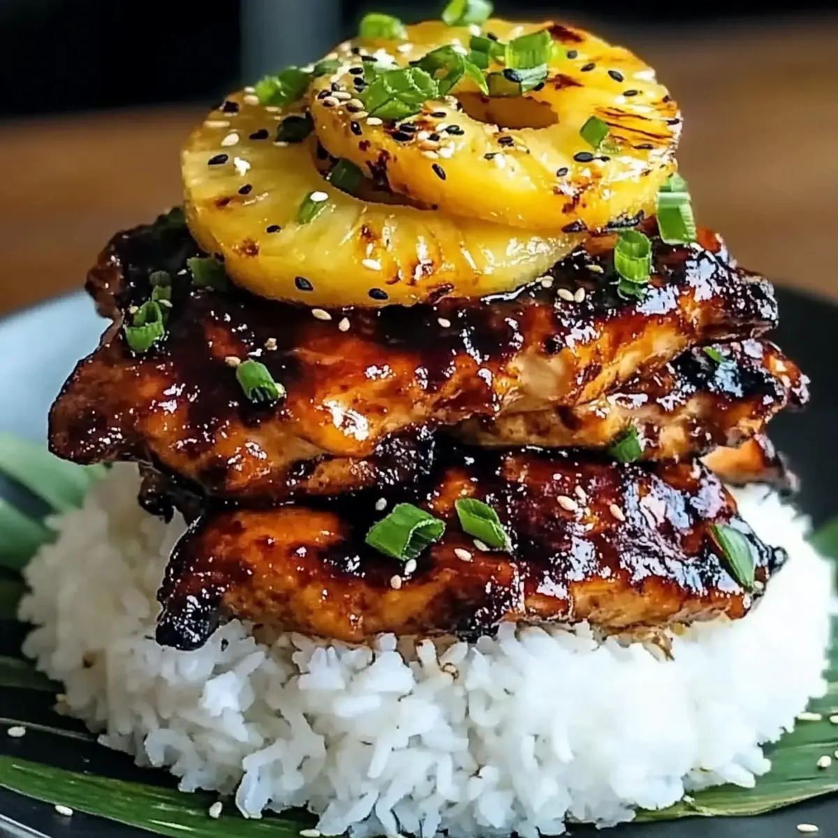 - To serve, start with a spoonful of cooked white rice, layer grilled chicken on top, add grilled pineapple, drizzle with glaze, and garnish with green onions and sesame seeds.