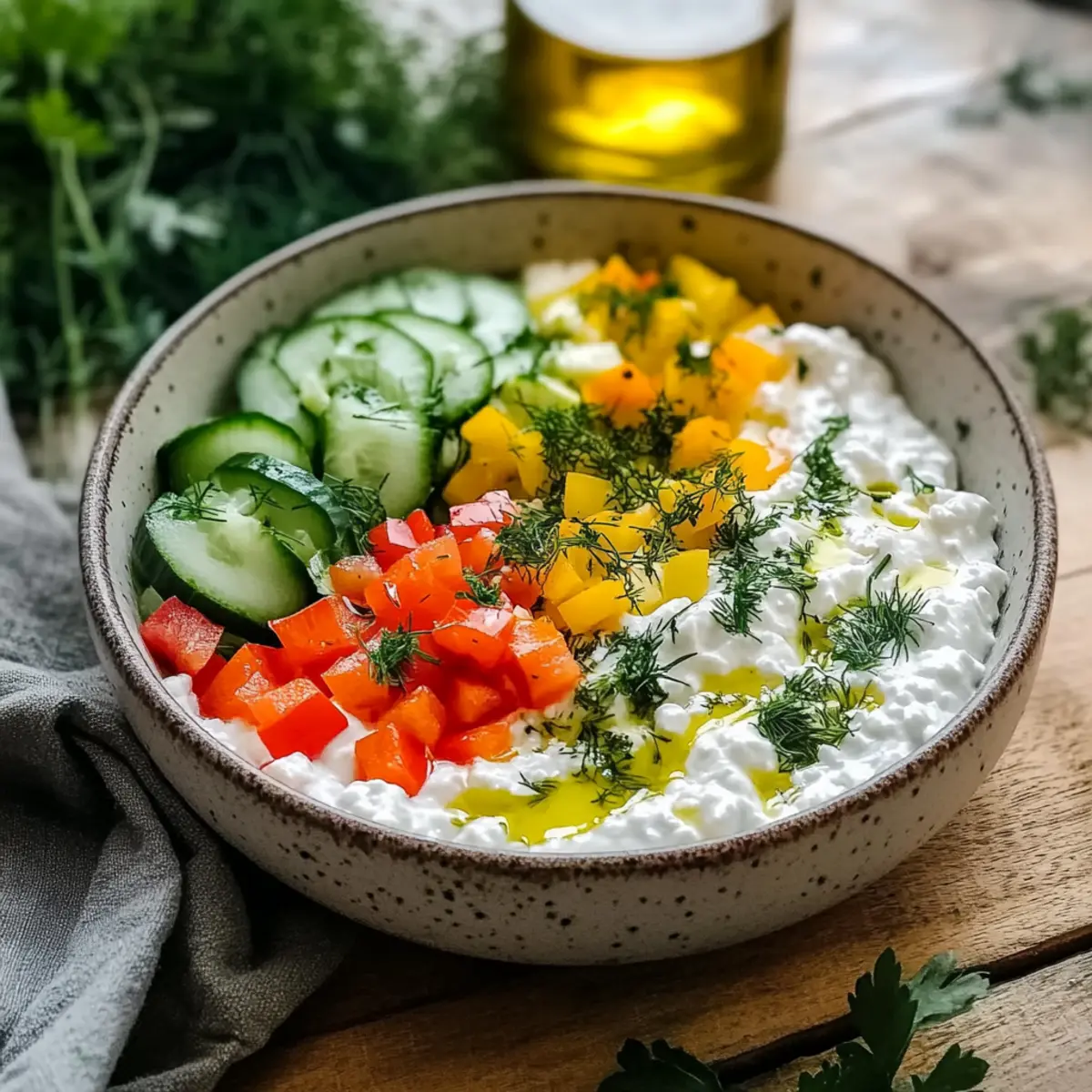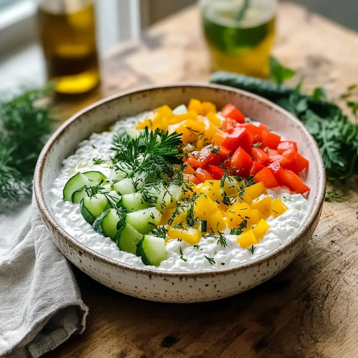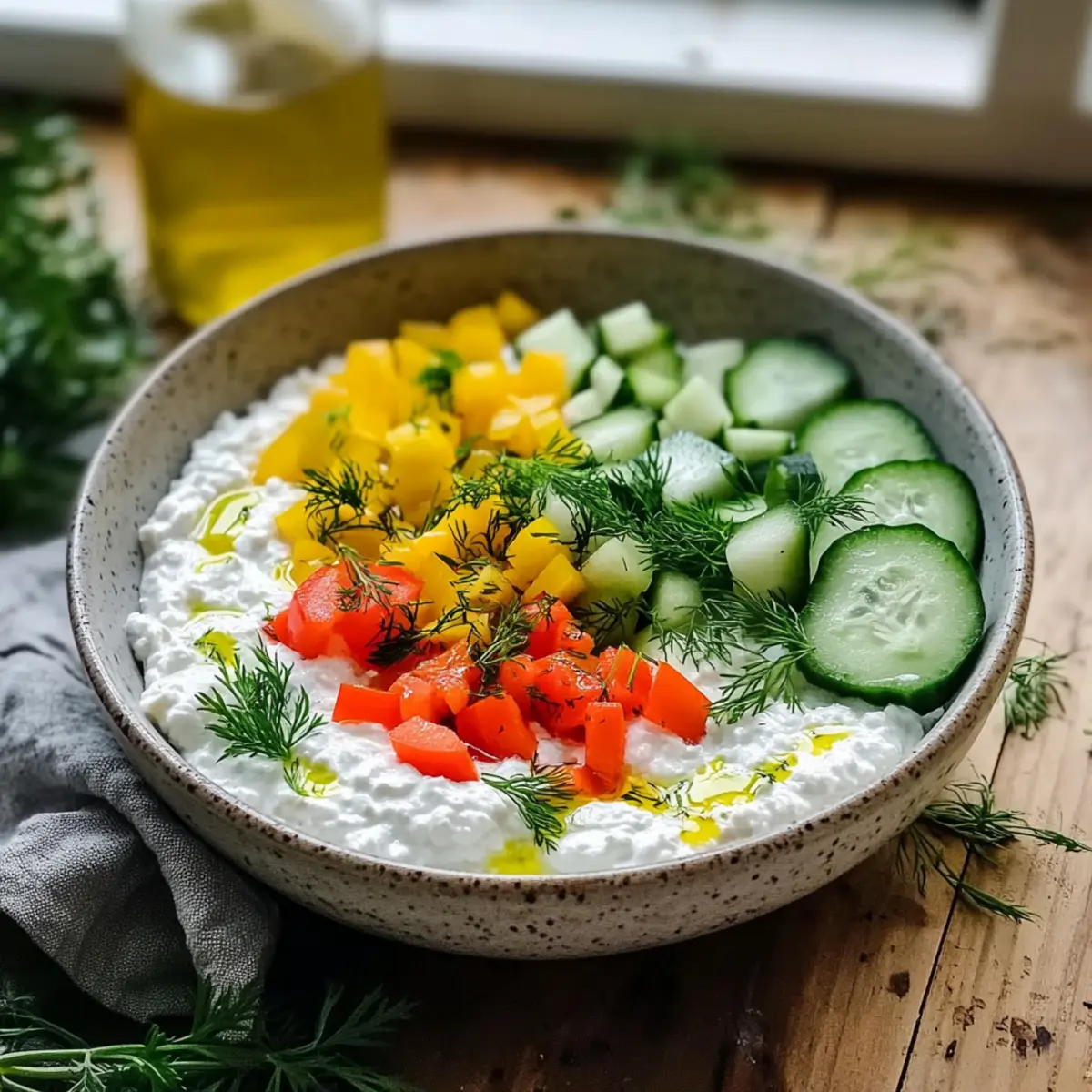 Vibrant Flavors: The colorful mix of bell peppers and crisp cucumbers not only looks amazing but packs a punch of freshness that elevates simple cottage cheese.