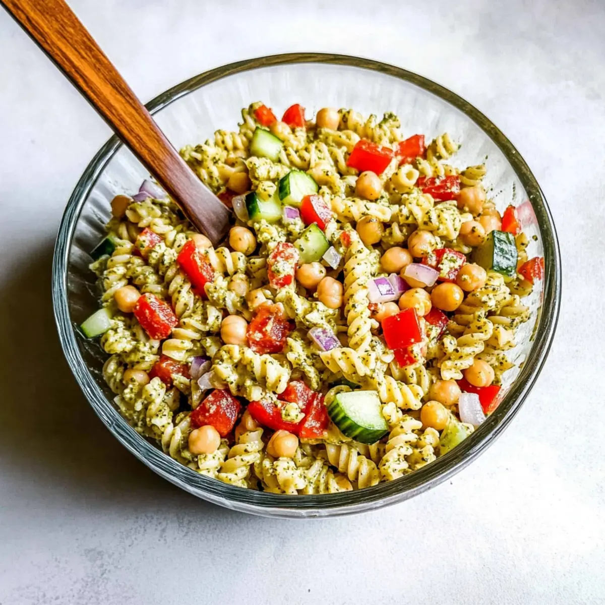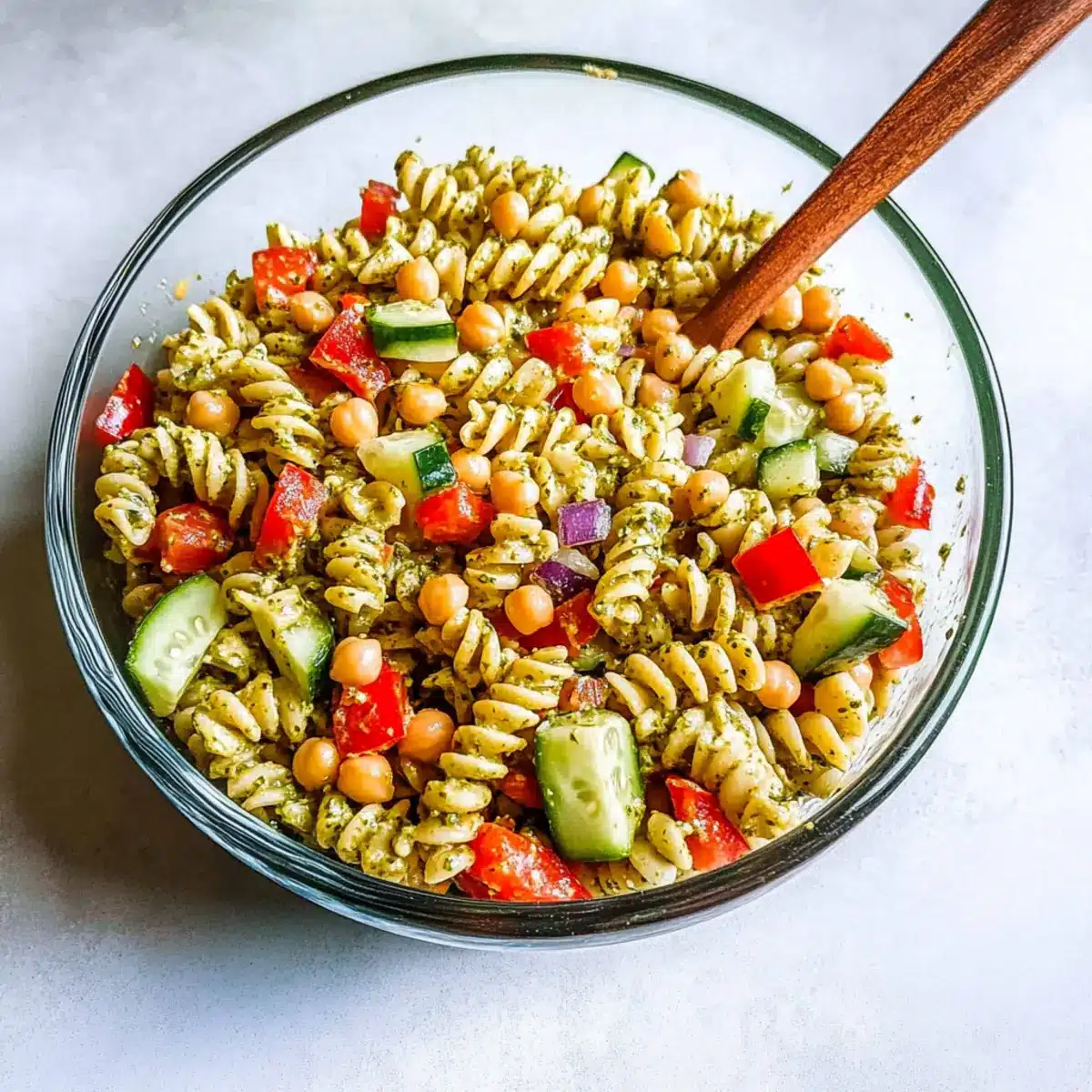 This High Protein Pasta Salad is a lifesaver for meal prep enthusiasts! You can prepare the salad’s components—cook the protein pasta, chop the veggies, and mix the chickpeas—up to 24 hours in advance. Just keep the prepared ingredients separately in the refrigerator to maintain their freshness and texture. When you’re ready to serve, simply combine the chilled pasta, veggies, Greek yogurt, and pesto, then toss to coat. This way, you enjoy a nourishing dish that tastes just as delicious as when freshly made. It’s the perfect solution for busy weeknights or gatherings, saving you time while ensuring you have a delightful dish on hand!