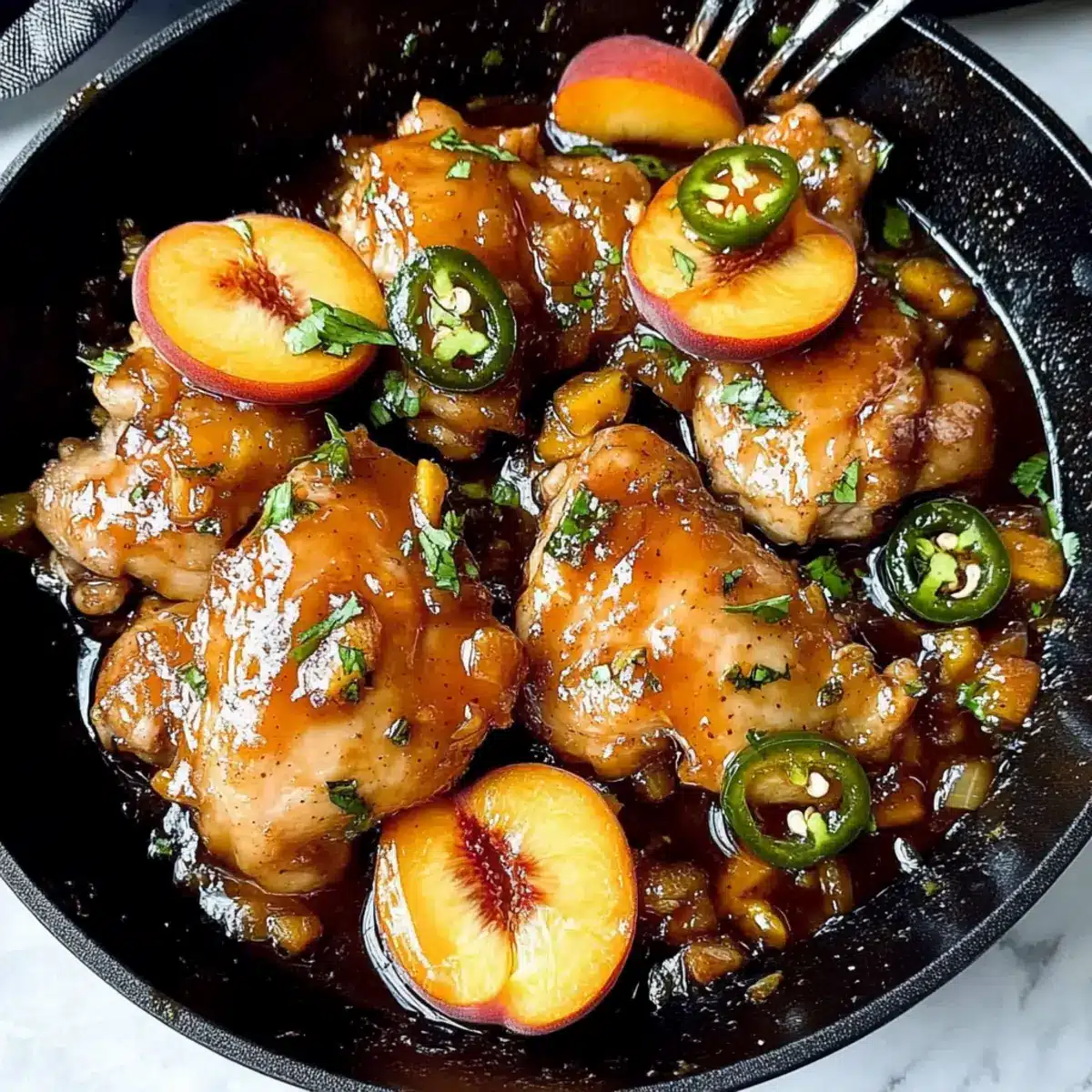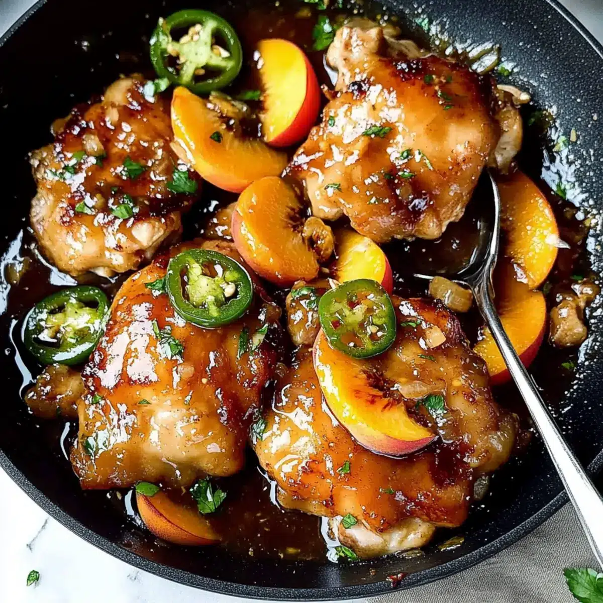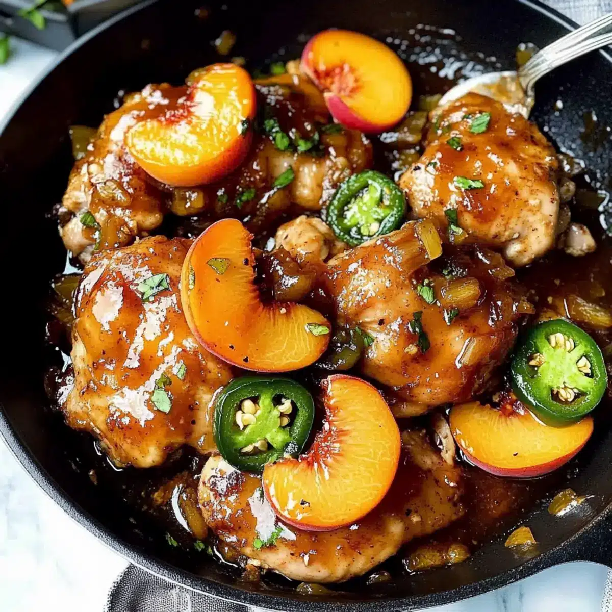 - Pour the prepared peach glaze into the skillet, stirring to coat the sautéed peaches and jalapenos evenly. Return the seared chicken thighs to the skillet, spooning the glaze over them. Let everything simmer together for an additional 1-2 minutes before serving.
